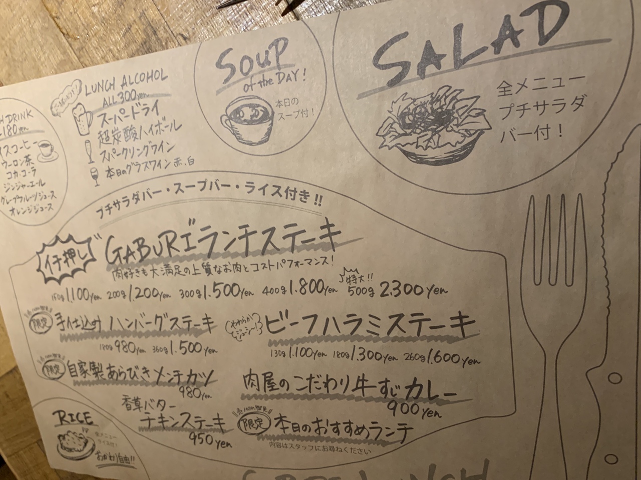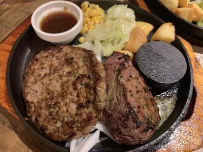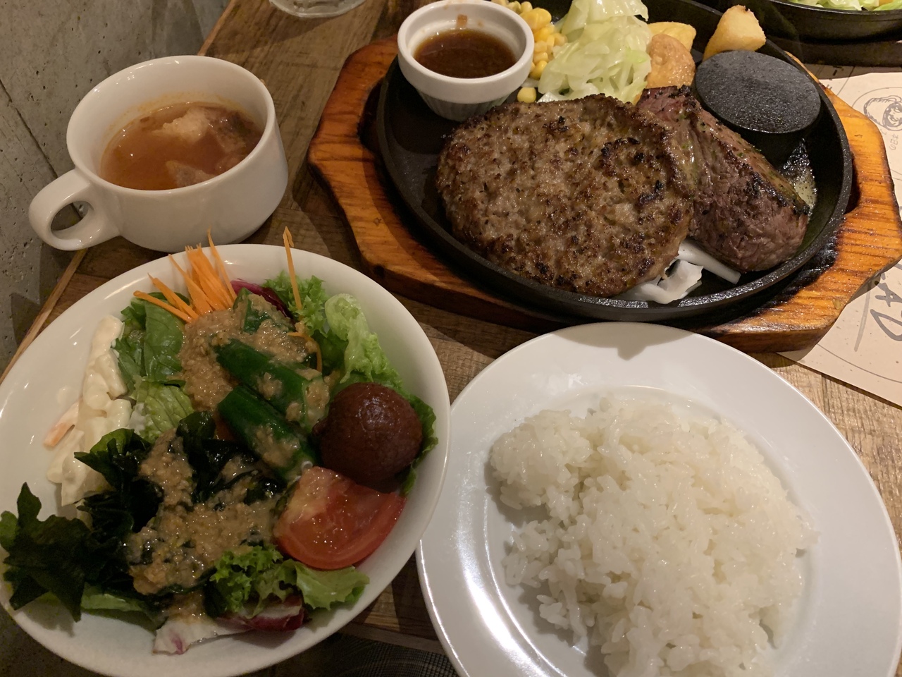 ランチはステーキと手ごねハンバーグがウリみたいです。がっつりお肉が食べたかったので、思い切ってステーキ&ハンバーグのコンボセットにしました1580円税別でした。肉肉肉なランチです。ステーキは中が赤いうちに出てくるので、鉄板の上に付いてくる石で焼き具合を調整しながら食べました。
