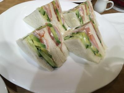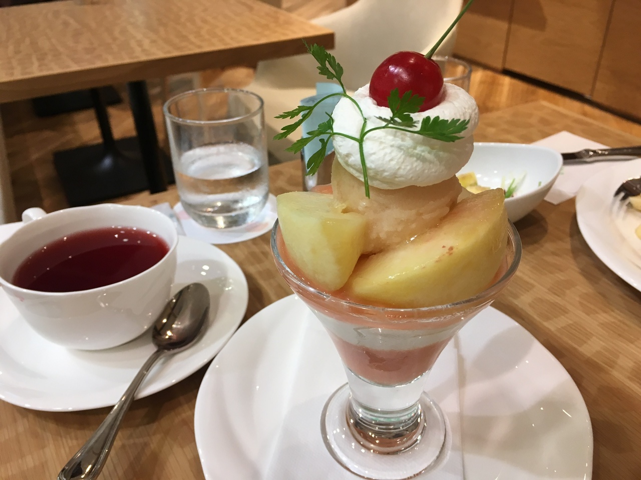 夜に行ったので、友人とサンドウィッチをシェアして、旬のフルーツ桃のミニパフェと紅茶のセットを頂いてきました。