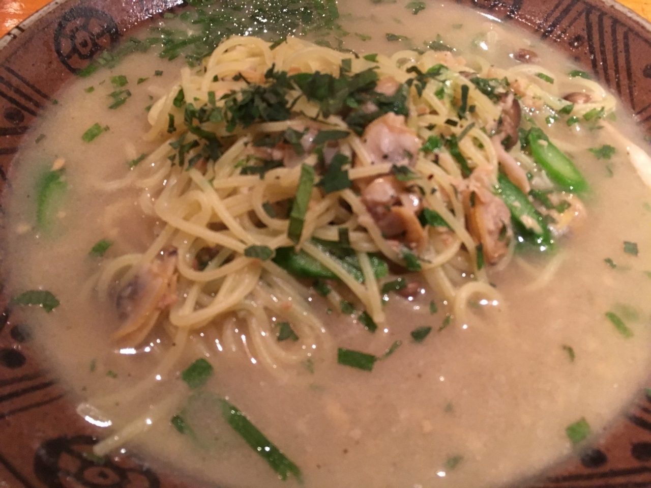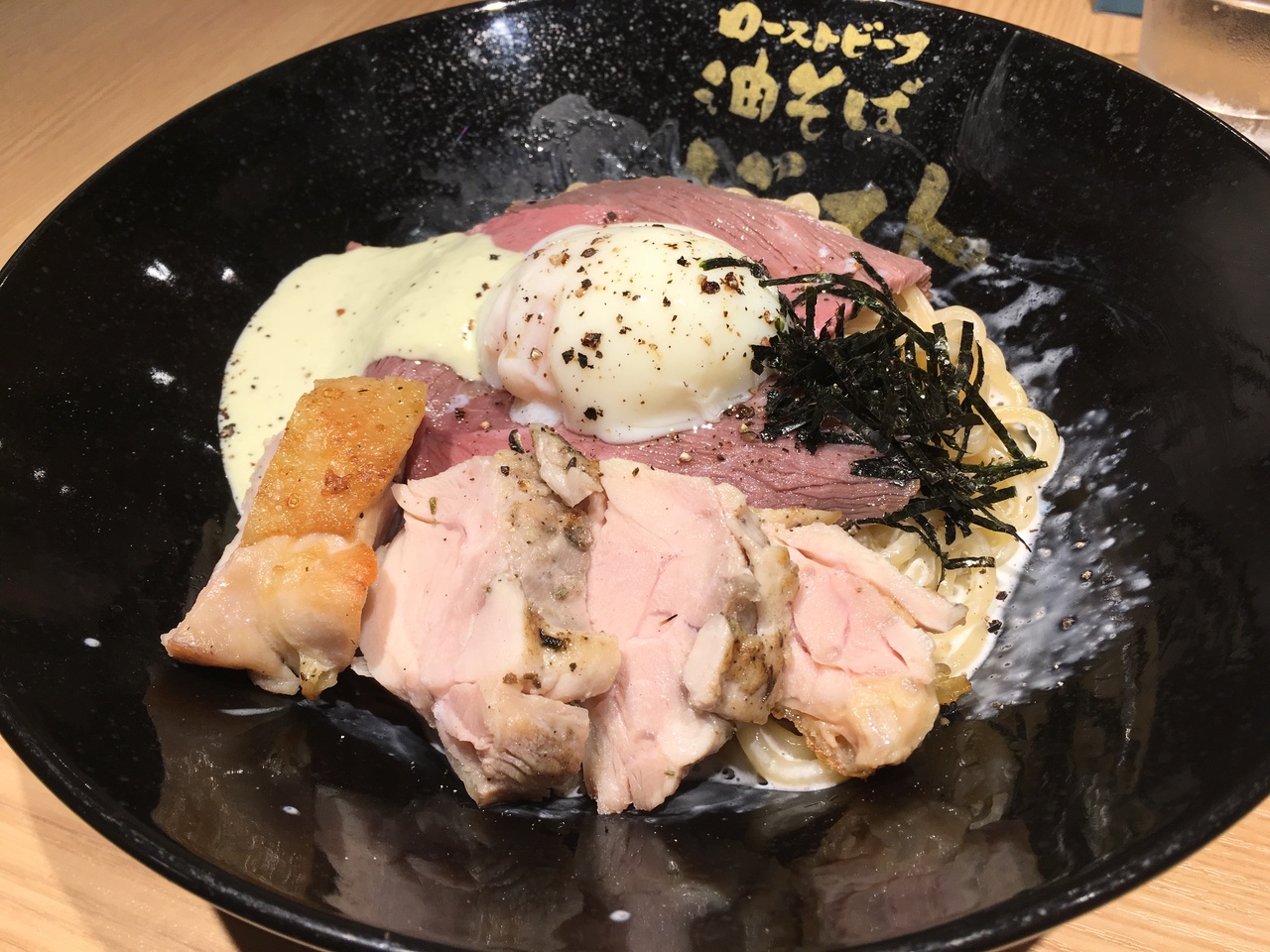席も指示されてすぐにラーメンが出てきます。器もおしゃれですね。集合時間から実際に食べられるまで30分くらい待ちました。