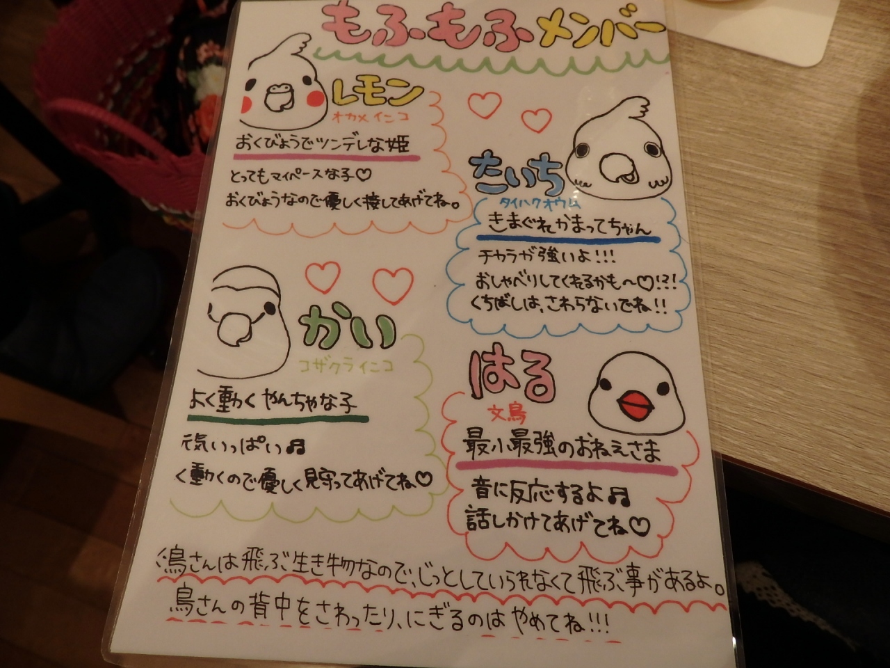 モフモフタイムという小鳥と触れ合えるサービスもあります。別料金で5分間1グループ3名まで¥500です。5分は短いと思っていましたが、やってみると充分な時間でした。