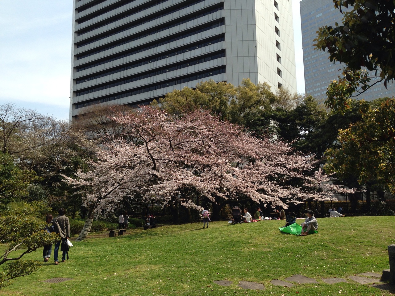 木陰でビニールシートを敷いてのんびり過ごす方やワンちゃんの散歩の方が
