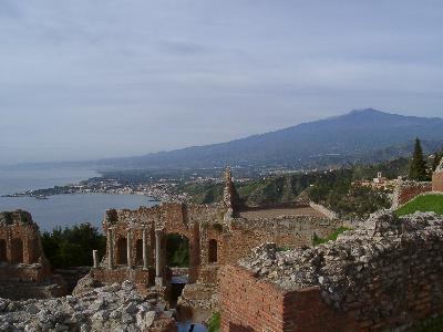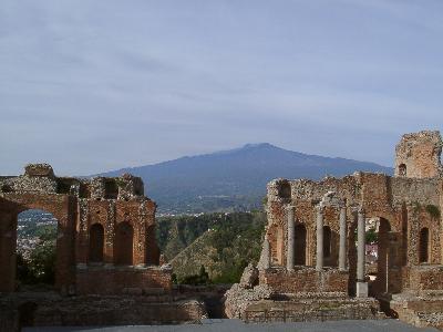 (写真 ギリシャ劇場の向こうにエトナ火山を望む) このギリシャ劇場は現...