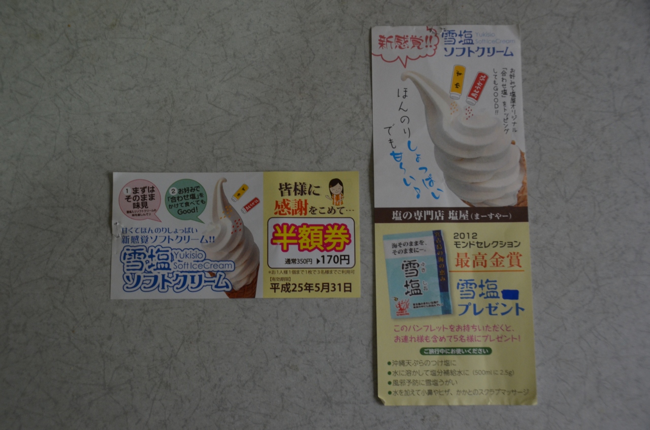 そして、私の泊まった宮古第一ホテルのロビーには今月31日迄ですが雪塩ソフトクリームが通常350円の所170円の半額券「1枚で3名様利用可」が有りましたので早速利用させて頂きました。