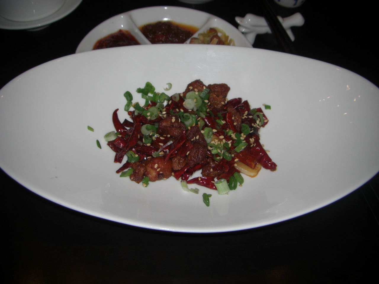 料理は辛さが5段階(赤唐辛子の数)表示されています。最も辛いのが赤唐辛子5つです。麻婆豆腐が4つで、赤唐辛子と鶏肉の炒めが5つです。共に食べましたが「うんぅ~ 辛い」。麻婆豆腐はご飯を頼み一緒に食べましたが、赤唐辛子と鶏肉の炒めは、鶏肉だけを探して食べるのですが、本当に辛く唇がヒリヒリでした。