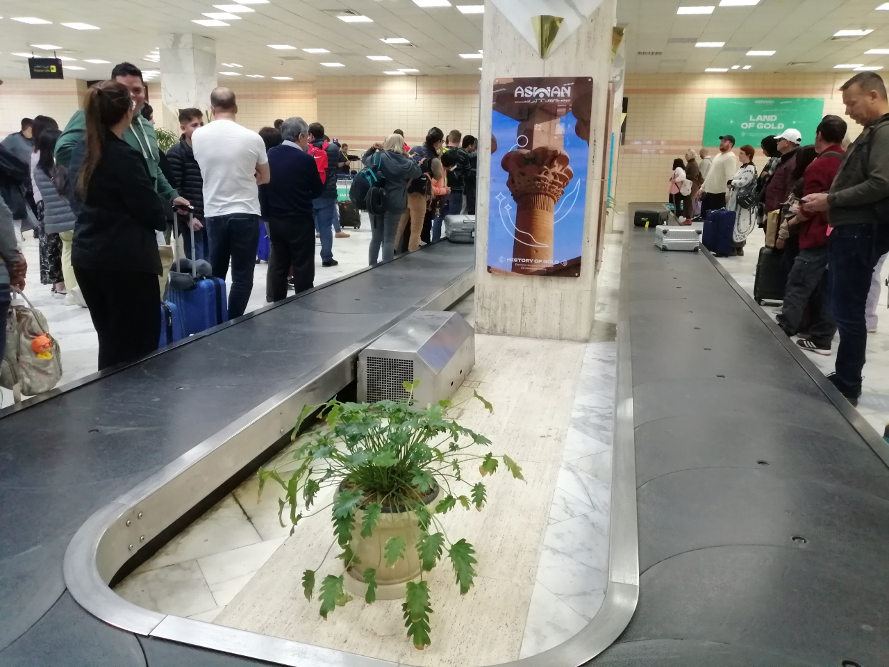 カイロからアスワンへ。エジプト航空で向かいました。とても小さな空港です。約1時間半程度のフライトでしたが、朝ごはんも出ました。なぜかわかりませんが、荷物が出てくるのに若干時間がかかったような気がします。