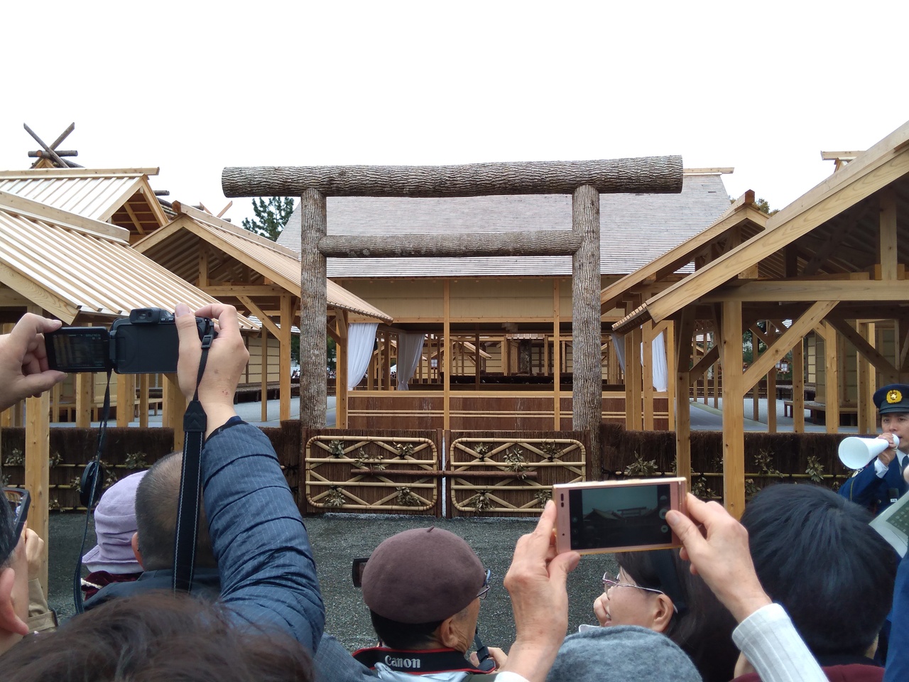 大嘗祭で使われた大嘗宮に行きました。天候のせいもあったのか、それほど混んではいませんでした。大嘗宮近辺は、多分通常も公開されているところなので、解体して元通りというのは理解できました。入口では所持品検査があるので、手荷物なしであれば右端からするっと入れます。