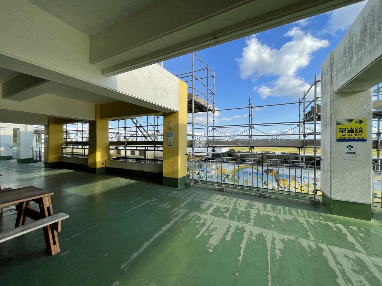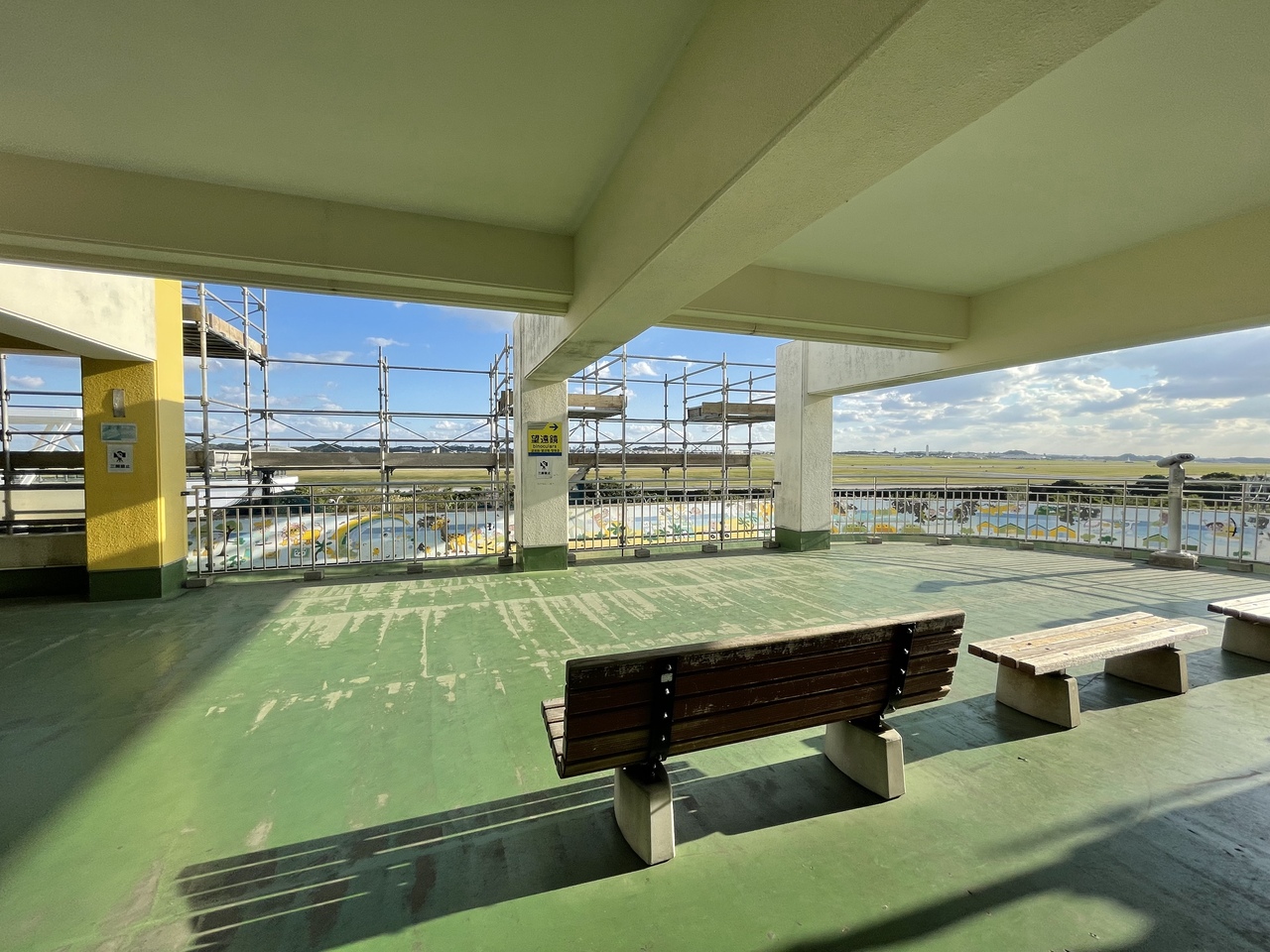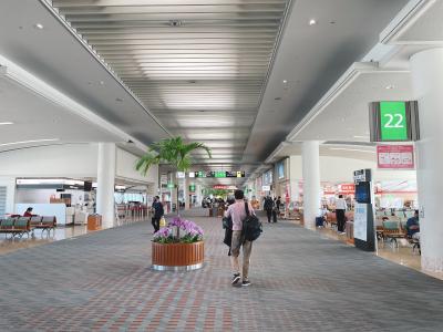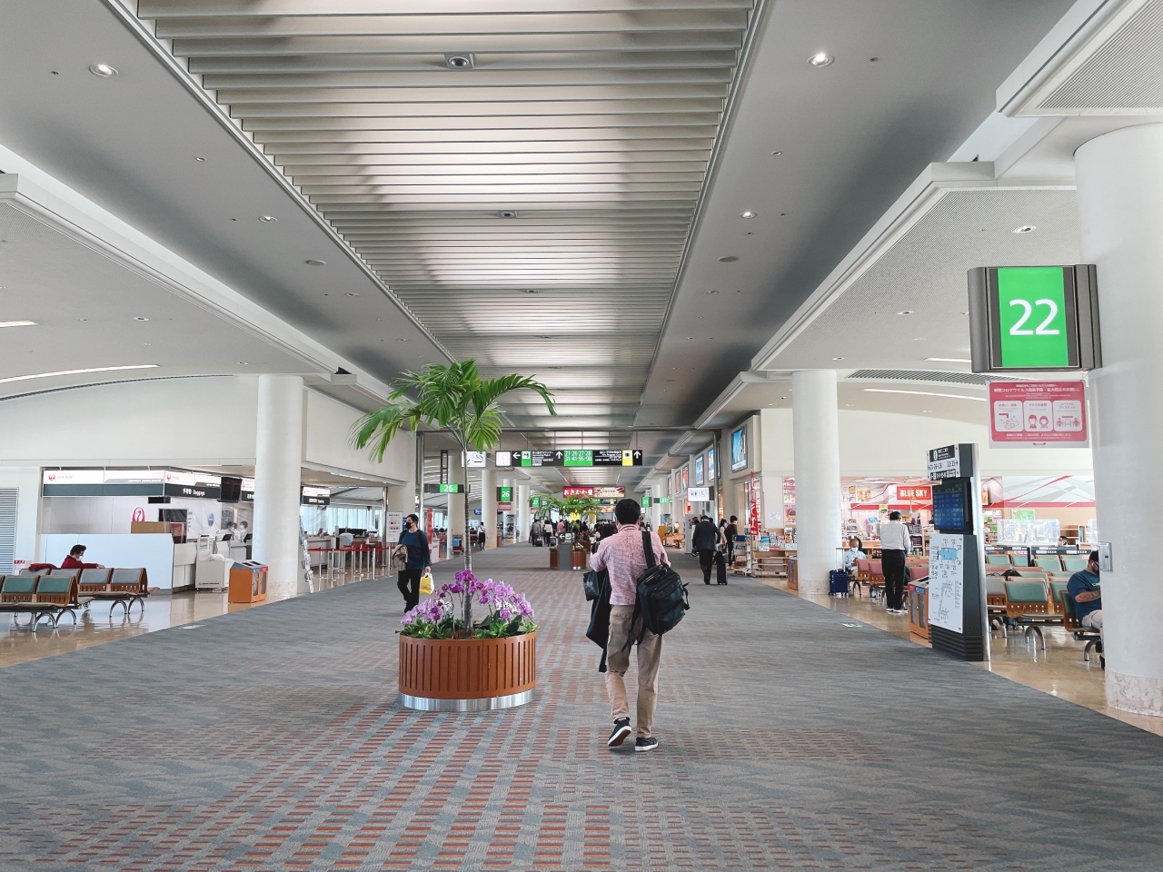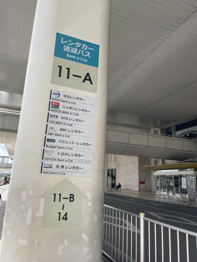 今回は友人が予約してくれたレンタカーで旅をするので、レンタカー会社のカウンターへ行って送迎バスの待機している柱の場所を確認して空港建物の外へ出ましたが、外へ出る前に国営沖縄記念公園の水槽があったので、一瞬ですが優雅に泳ぐ魚たちを観ました。