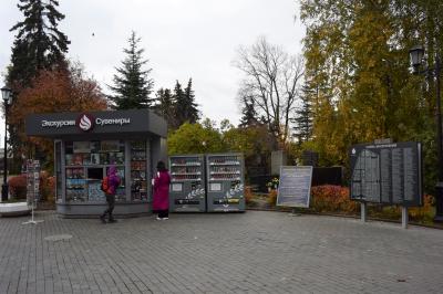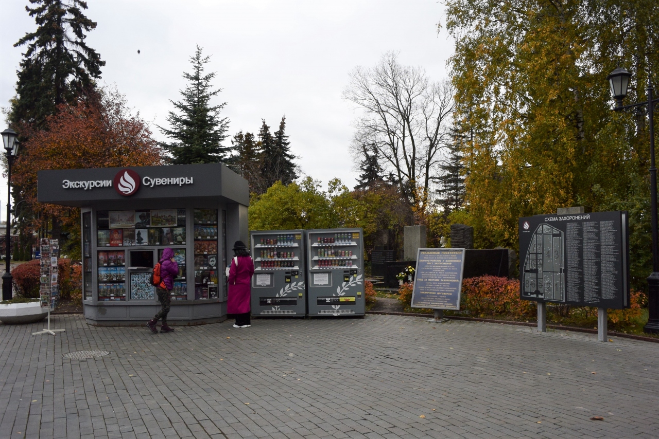 入口にあった案内板で著名人のお墓の位置は分かるようになっていますが、表記はロシア語でした。英語表示のパンフレットは案内図近くの売店で購入したように記憶しています(当時のメモがなく値段は不明です)