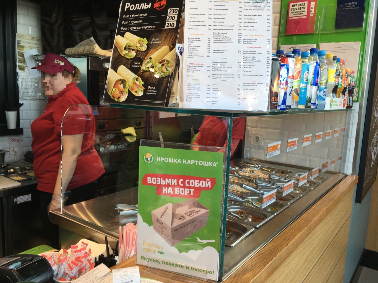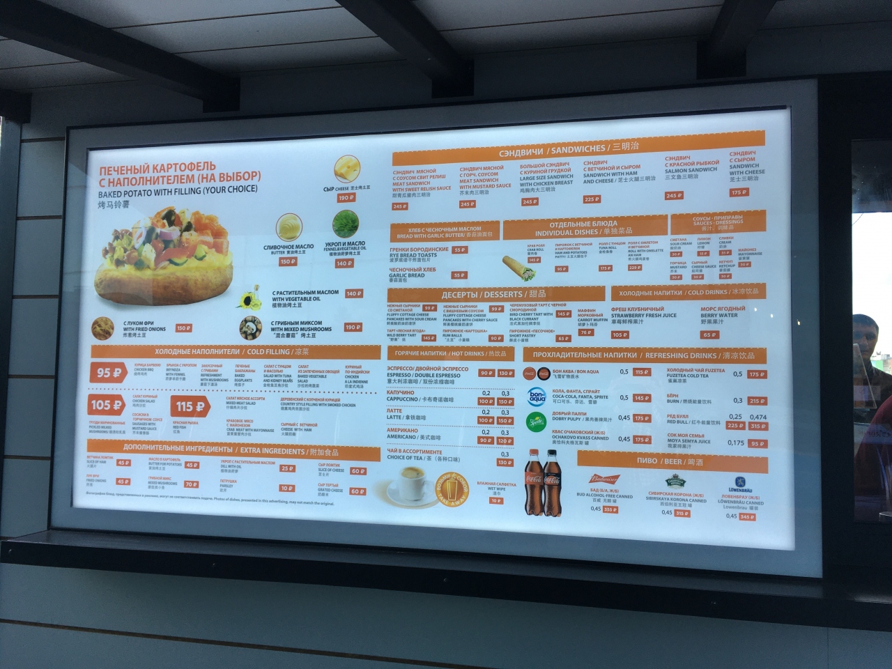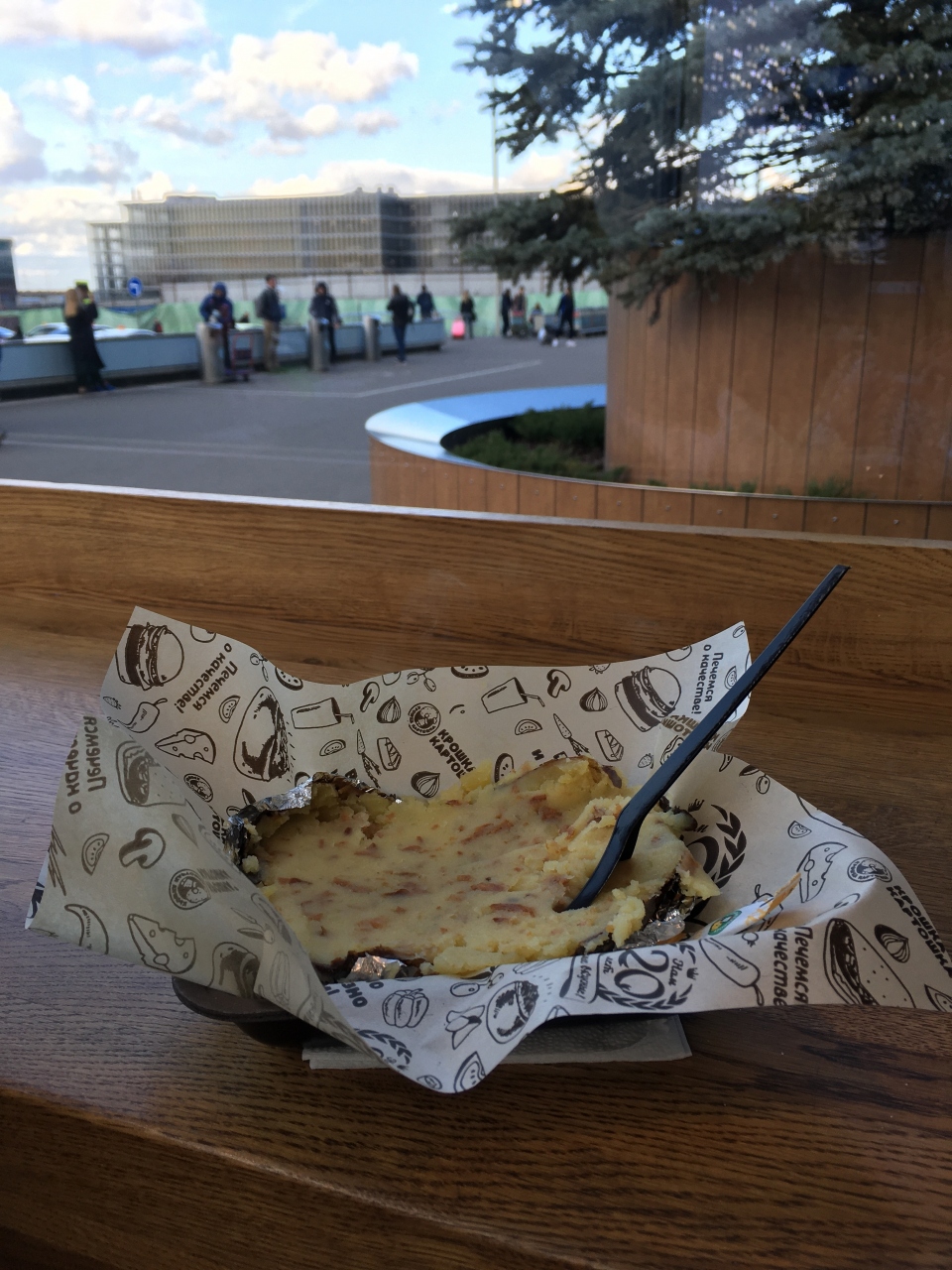 飛行機に乗るのであまり時間がなく、取り敢えずポピュラーな「ベイクドポテト(フライドオニオン付き)」150ルーブル(約250円)だけ注文。現金で支払。