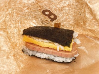 ご飯、玉子、ポークランチョンミート(SPAM)を海苔で包んだおにぎりです。