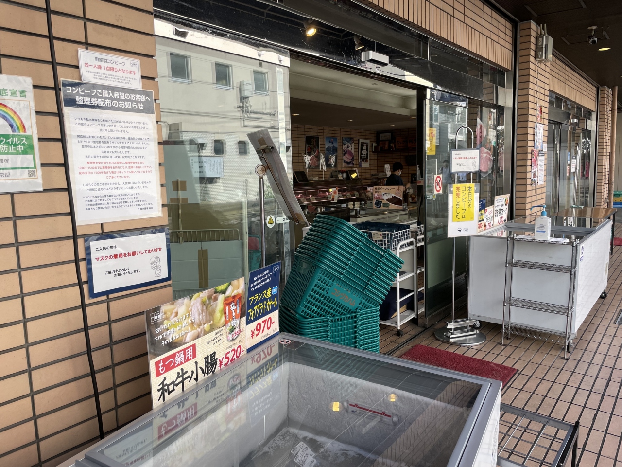 ドアが全開で換気バッチリ、入店の人数制限、入口に消毒液。