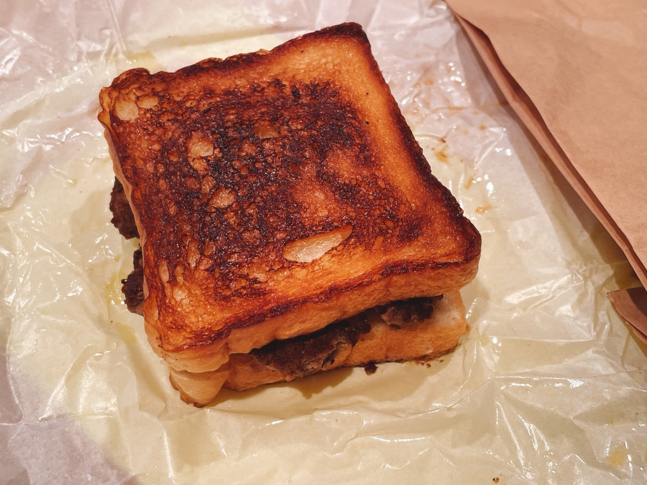 紙袋を開けて驚いたのがバンズではなくこんがり焼かれたパン!