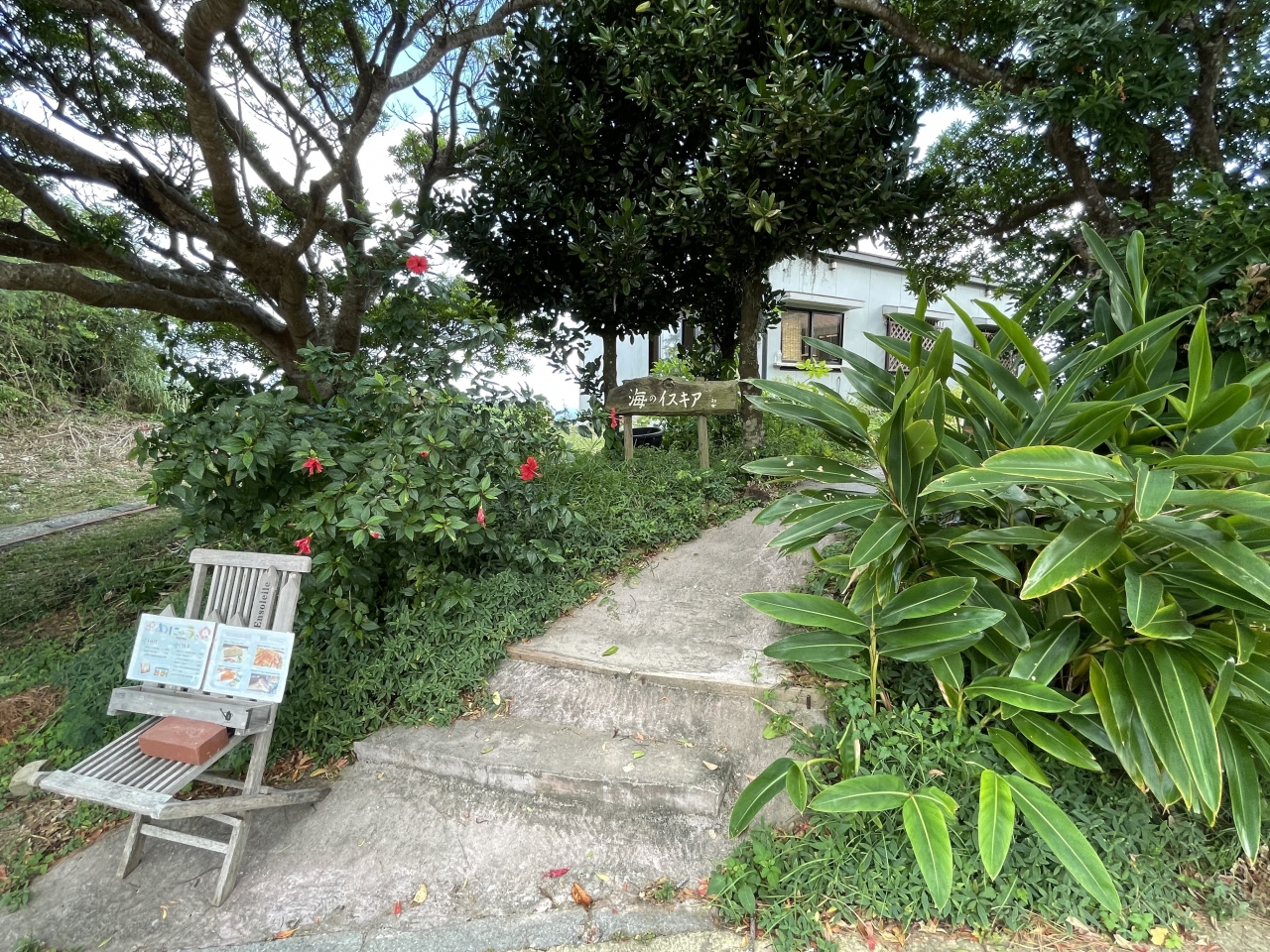 「斎場御嶽」から「がんじゅう駅・南城(斎場御嶽のチケット販売や駐車場がある)」へ戻る途中、左側にカフェの看板があり、奥を覗くと広いお庭がステキだったので入ってみました。行きには気づかなかったくらい看板は木陰にさりげなく添えてあります。