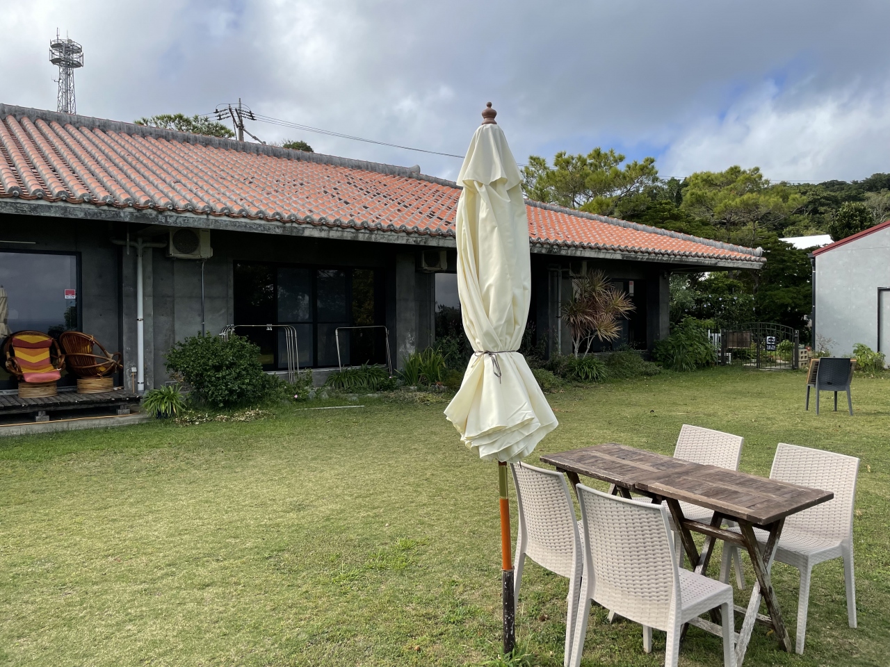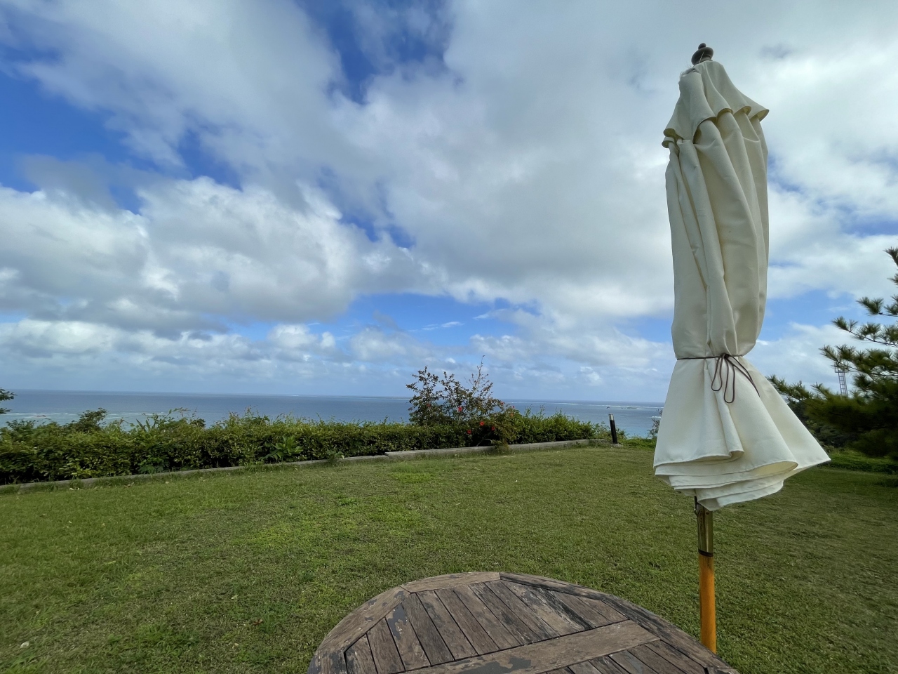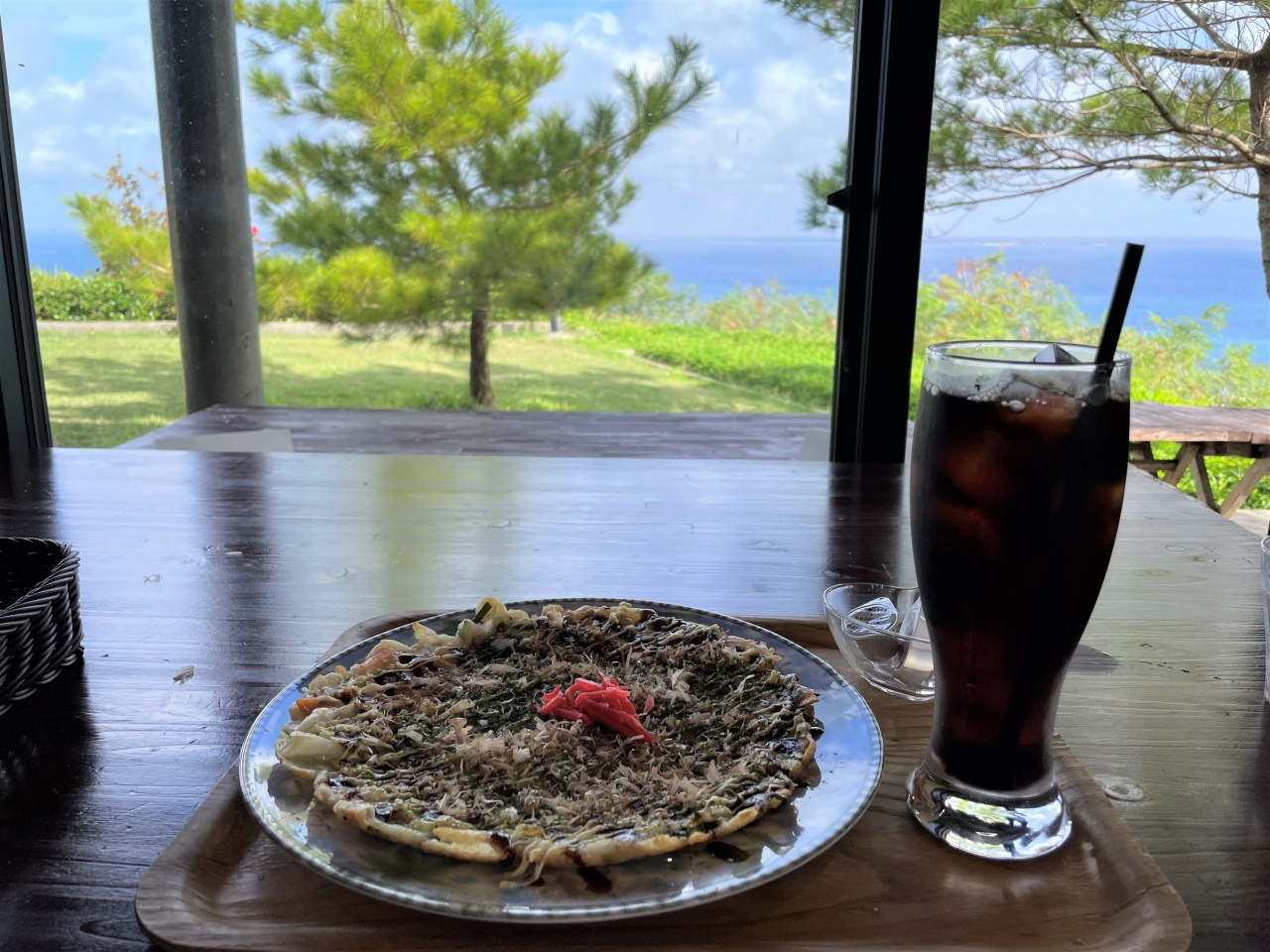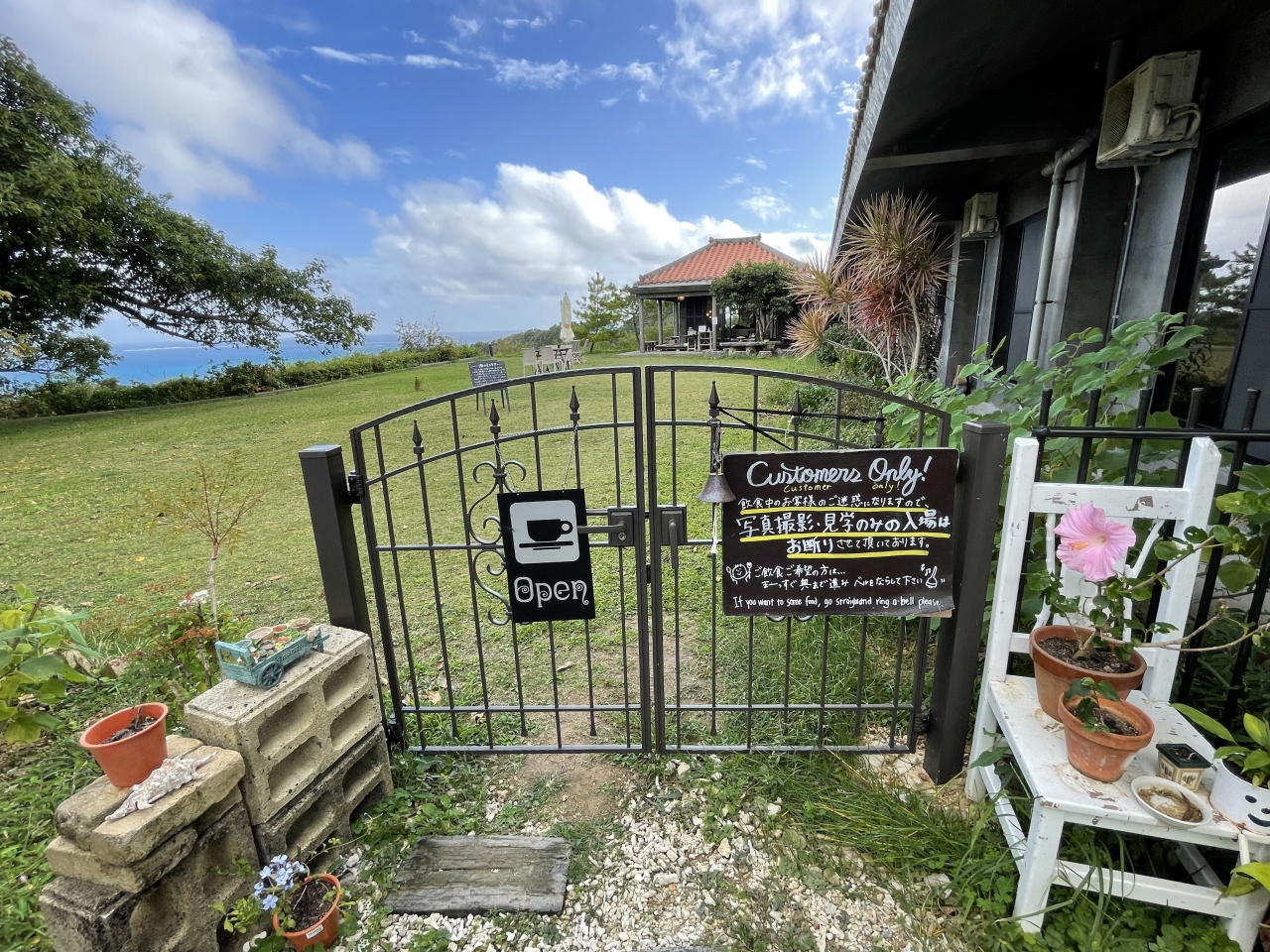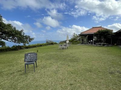ここは個人のお宅を一部開放してカフェをなさっていて、まずお庭に入る戸を開けると、青々と広がる芝生の奥に美しい知念の海を一望!