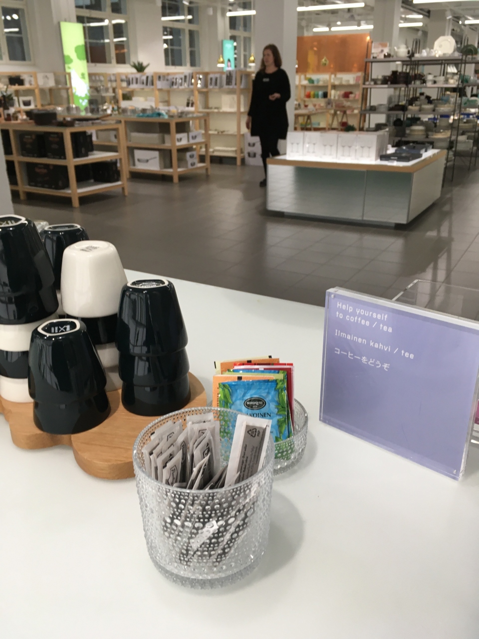 一番奥にフリードリンクコーナーがあってイッタラの食器で無料のコーヒーが飲めます!