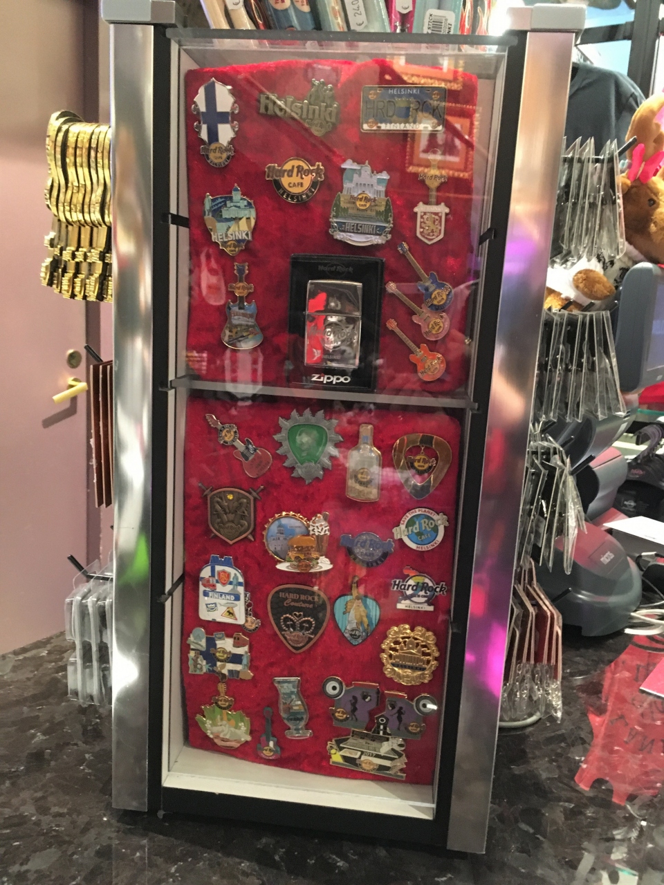 ハードロックカフェのピンバッチはご当地のデザインを見るのが楽しくて、海外では旅の記念にいつも買って集めています。