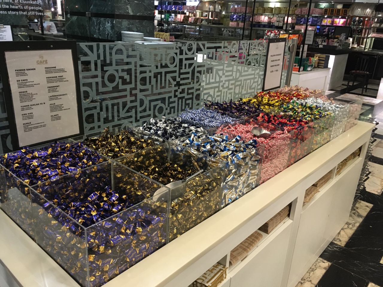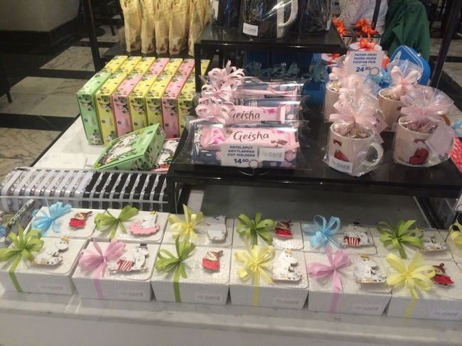 お土産コーナーのチョコは、ファッツェルで有名なGeishaチョコや、ムーミンの絵が付いたチョコなどとても可愛くラッピングされていて、多数あるので迷います。