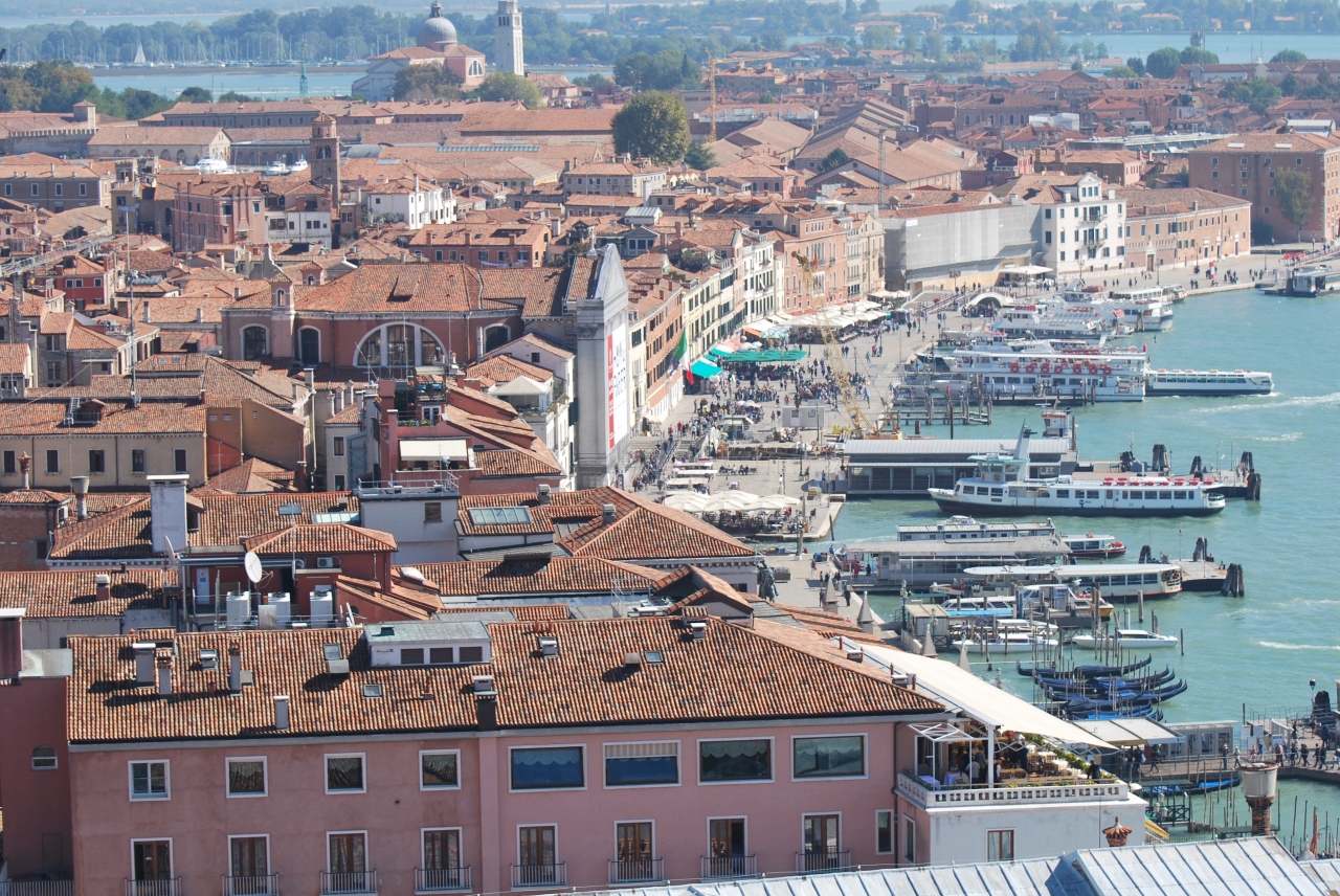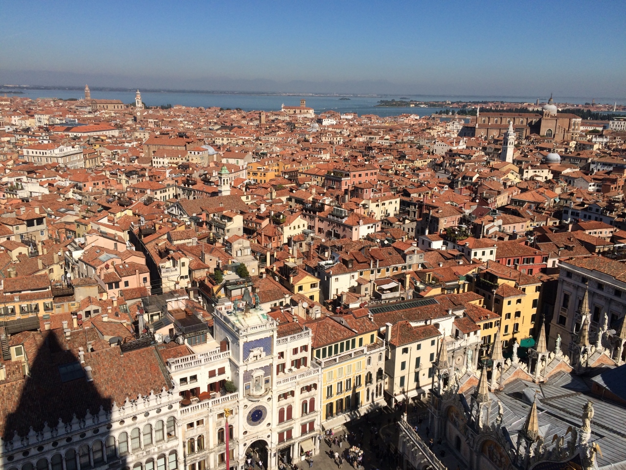 上から見ないと見えない物。例えばサンマルコ広場に並べられたカフェフローリアンのテーブルとイスの配置とか、サンマルコ寺院のドームの形とか、ゴンドラの行き交う様子といか・・・