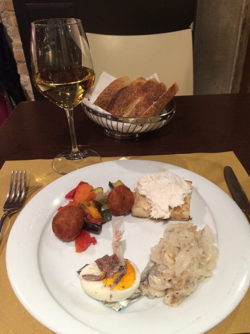 4種チッケッティの盛合せ(12ユーロ)と白ワイン(7ユーロ)
