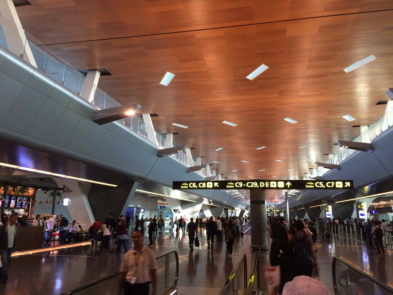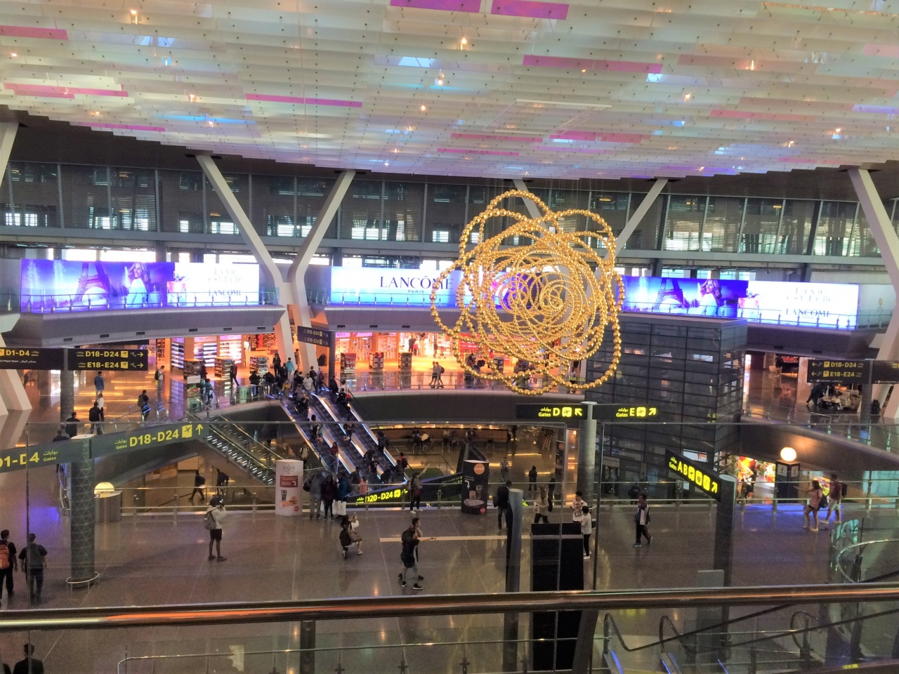 カタールの公式サイトで、ドーハのトランジットが1時間15分でも予約出来ましたが、実際には沖止めで時間がかかり、空港内も広いので、短時間のトランジットは危険だと思いました。
