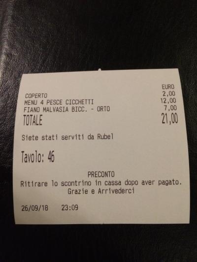 テーブルチャージ(2ユーロ)合計21ユーロ(2,856円)- 旅行時期