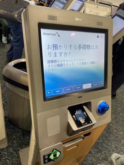 まずは友人のアメリカン航空ロサンゼルス行。チェックイン機が日本語対応で荷物タグも友人が付けて問題なく完了。ゲートは到着と同じエアーサイド3でセキュリティチェックへ。