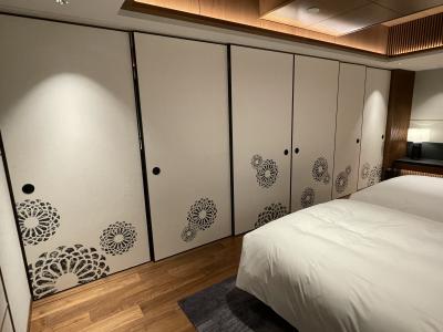 全体に落ち着いた色調の家具で和を感じ、寝室とリビングを分ける仕切りもあり、檜の香りがする広い浴槽の檜風呂も良かったです。