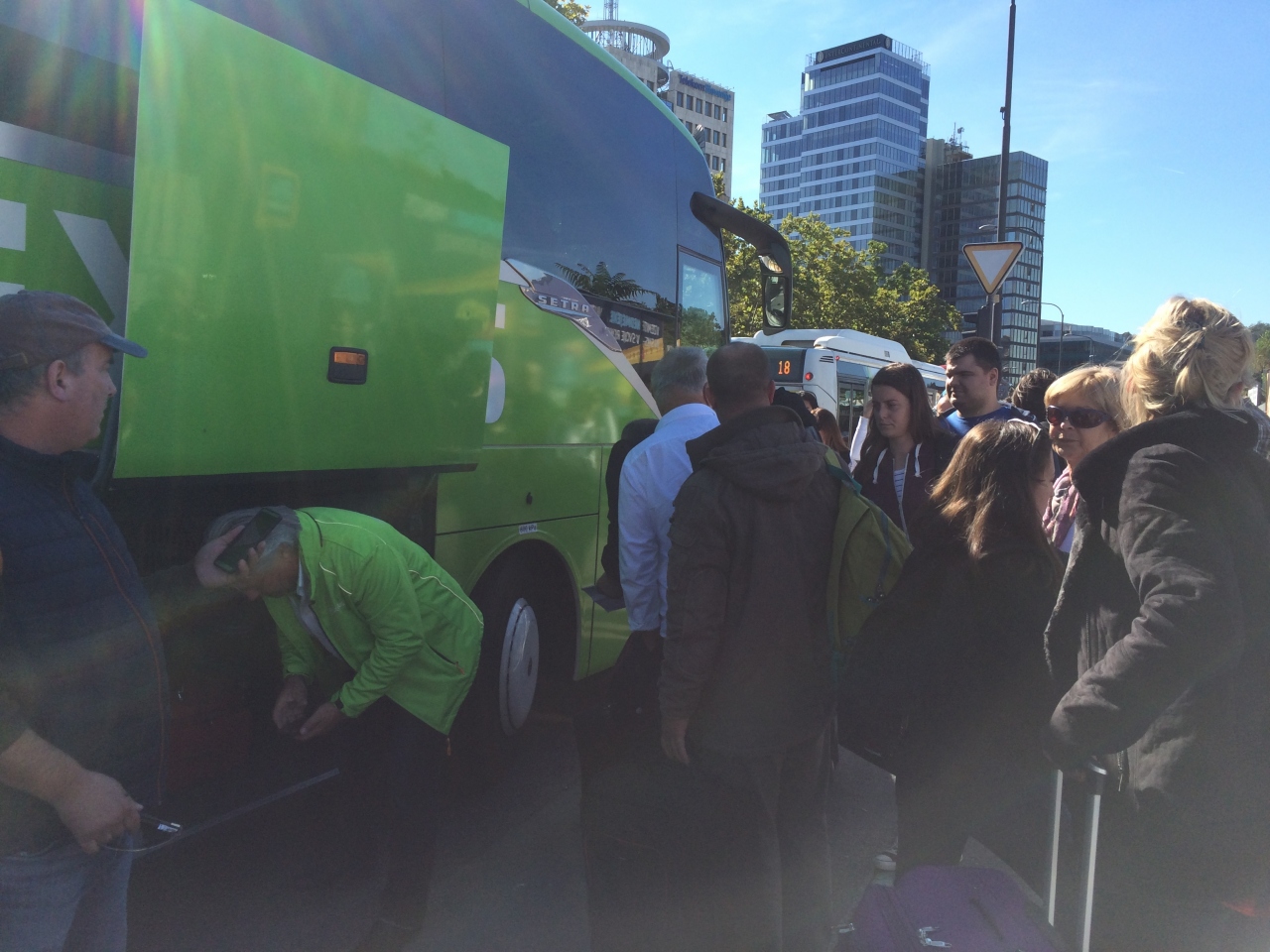 フリックスバスは国際長距離バスで、料金は格安、蛍光ミドリが