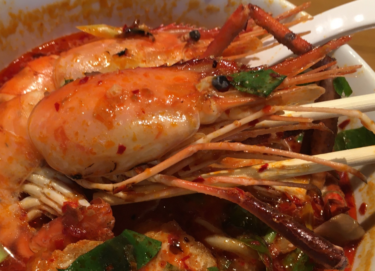 麺は数種類から選べたので卵麺を選択、プリプリの海老が2尾入ってきました。