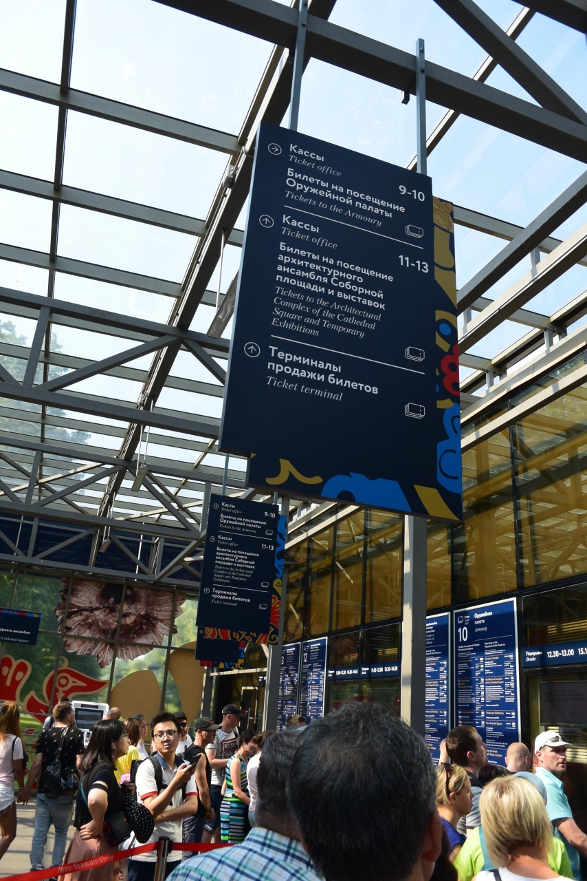 案内板は英語表記があります。窓口の人はロシア語しか話しませんが、窓口と対面にあるインフォメーションは英語が話せる人がいました。