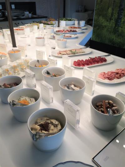 食べ方には伝統的なルールがあり、一度に山盛りにせず、少しずつ種類ごとにお皿に盛り付け、順番(最初はニシン料理7種から食べ始め、冷たい魚料理、冷たい肉料理、温かい料理、デザートの順)に食べていくとマナーが良いとされていますが、スモーガスボードはその順に並んで取りやすいようにしてありました。