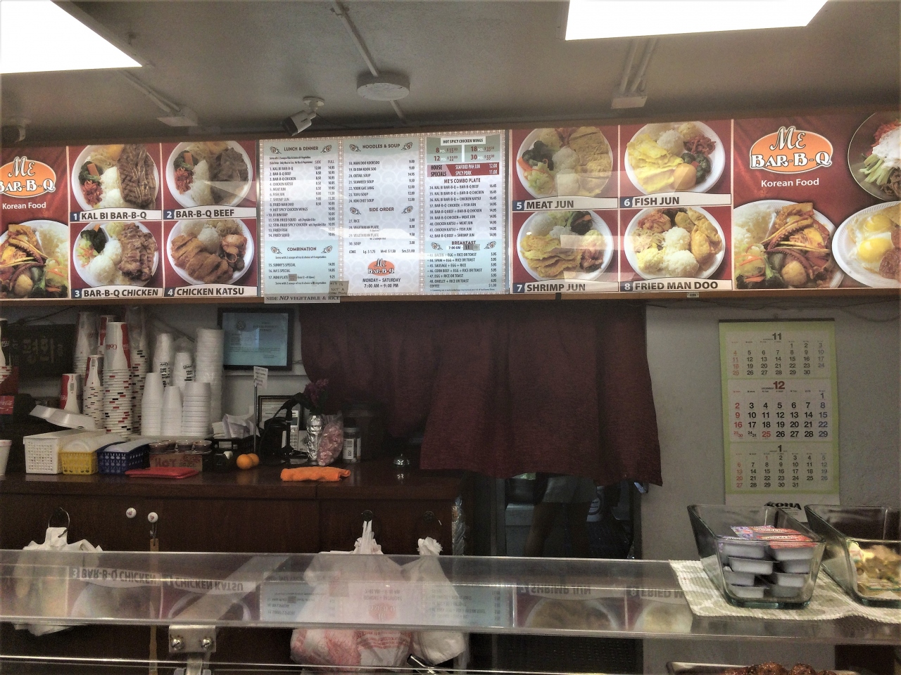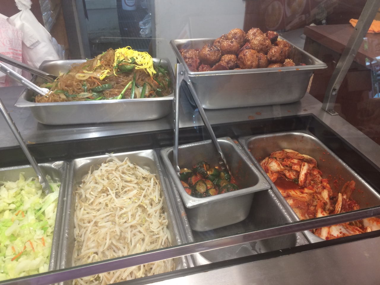 レジで支払ってから、ショーケースの中にある付け合わせを選んでプレートに入れてもらいました。付け合わせはナムル、キムチ、チャプチェ、ジャガイモなどありました。- 旅行時期