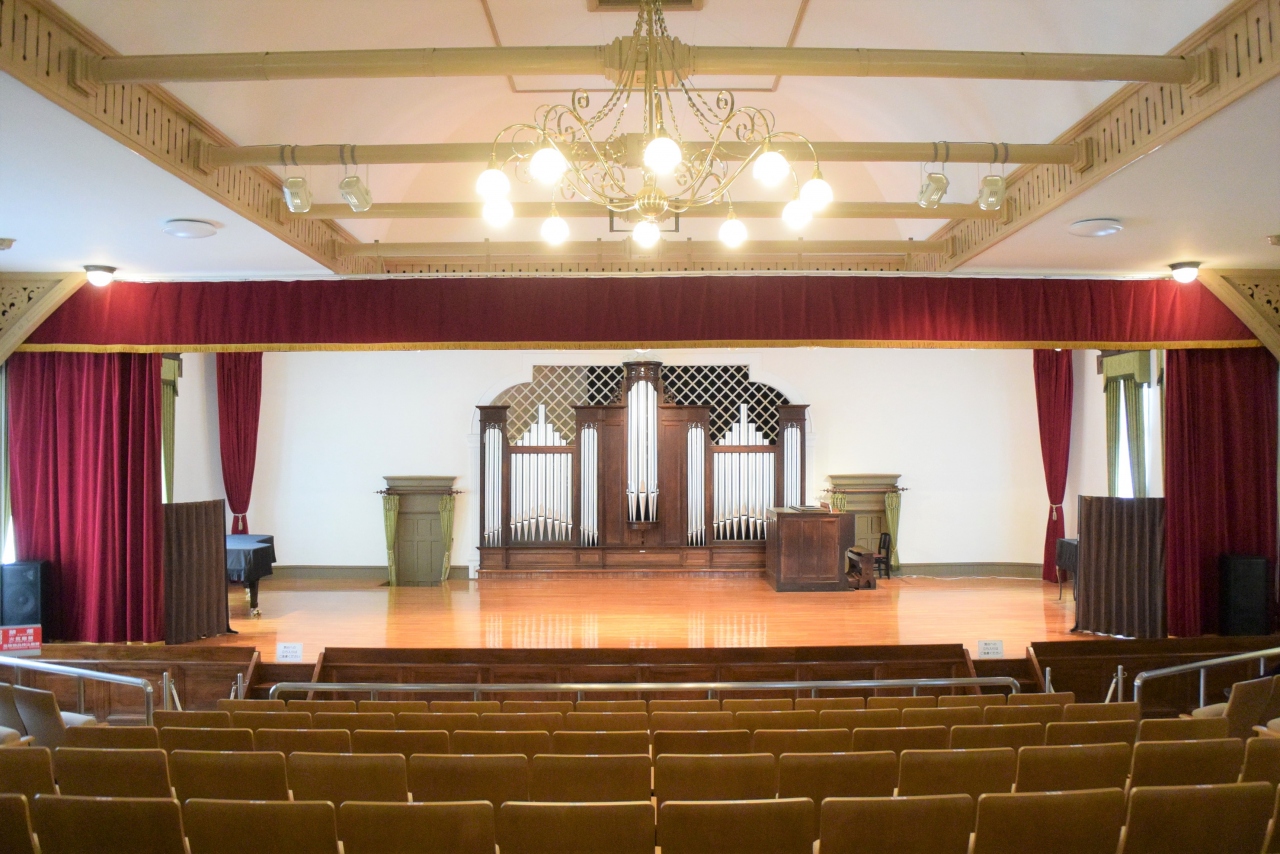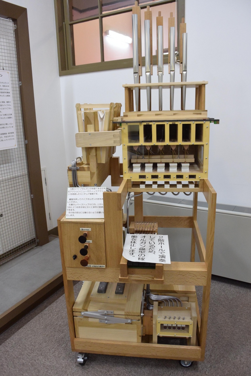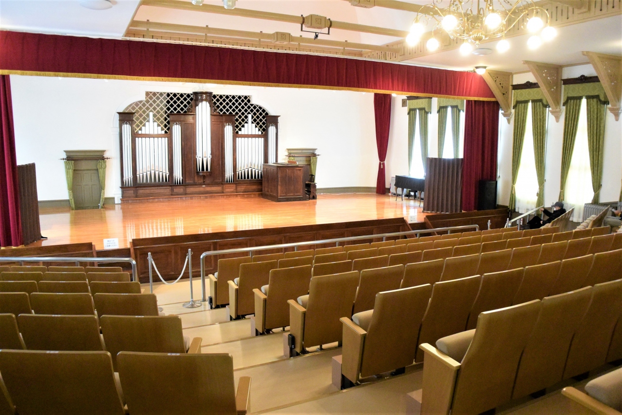 2階は日本最古の洋式音楽ホール(奏楽堂)で、このホールは瀧廉太郎がピアノを弾き、山田耕作が歌曲を歌い、三浦環が日本人初のオペラ公演でデビューを飾った由緒あるホールとのことです。正面にはパイプ数は1379本、世界でも珍しい空気式アクション機構(ニューマティックアクション)という日本最古のコンサート用オルガンがありました。なお、ニューマティックアクションとは空気圧を利用して音を出す仕組みです。