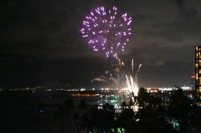 ラナイから夕日やヒルトンで行われるアロハフライデーの花火が見えました。