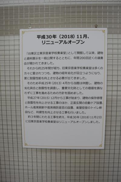 上野公園内にある重要文化財、旧東京音楽学校奏楽堂は、3年かけて保存工事が完了し平成30年11月にリニューアルオープンしていましたが、東京都内の施設がいくつか無料になった2/24(日)にたまたま奏楽堂の前を通りかかったらこちらも無料だったので入ってみました。