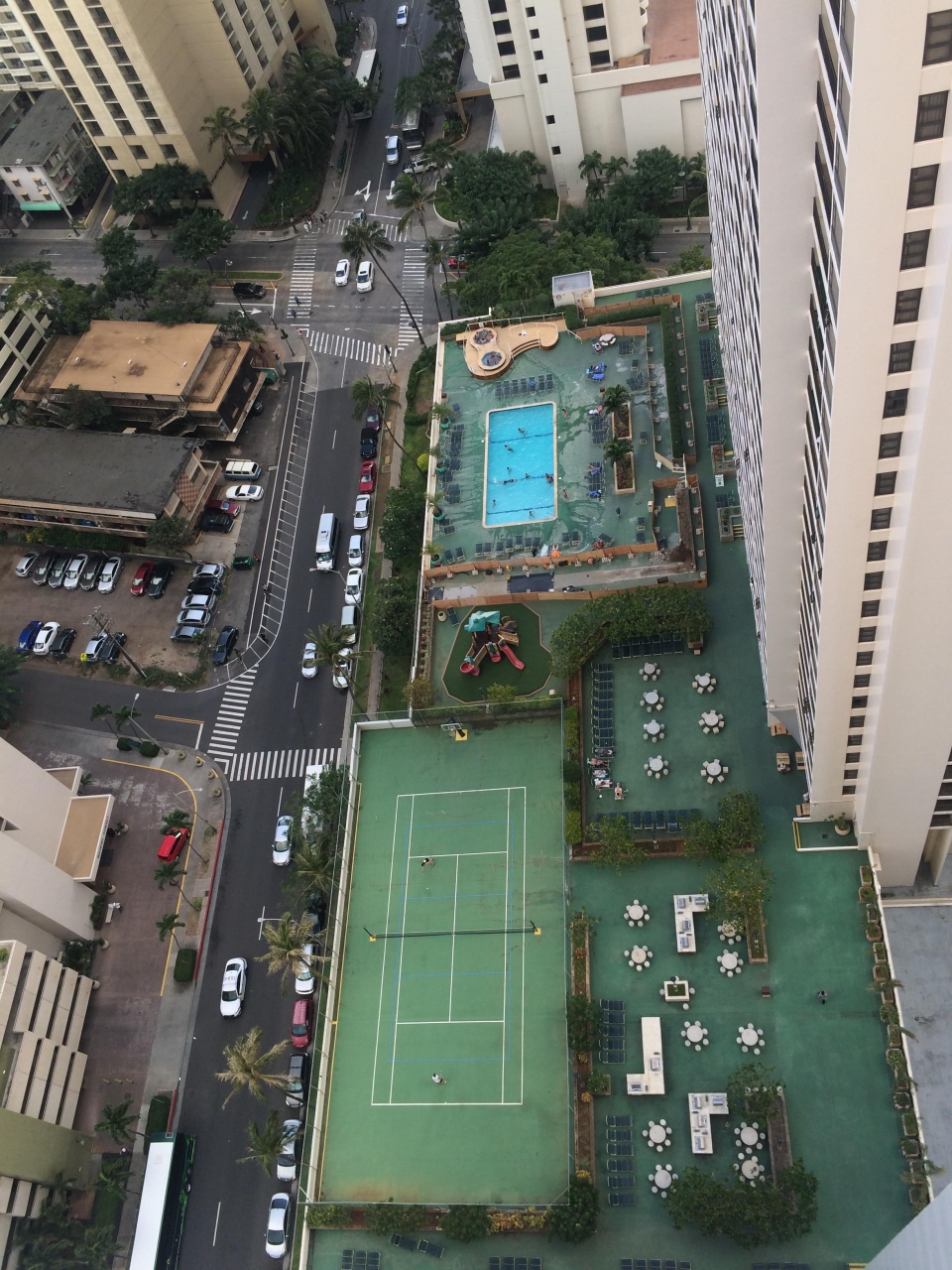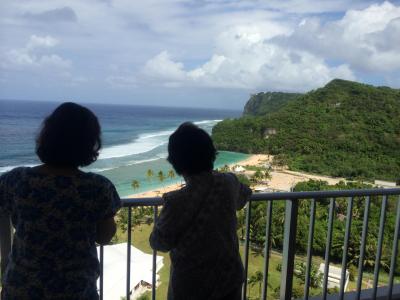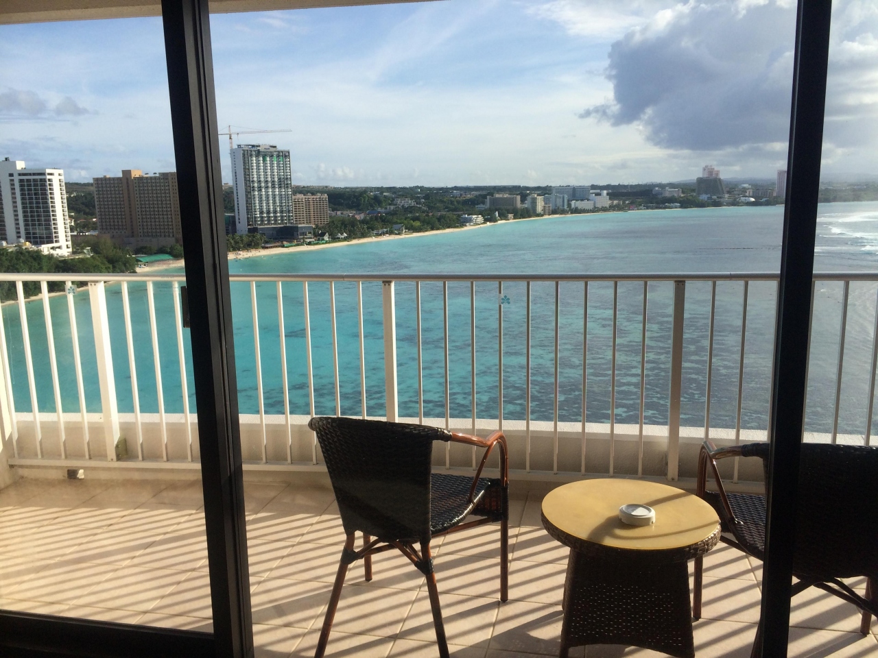 部屋は最上階、ベランダにテーブルとイスがあったので、初日はビーチやプールやショーを眺め、翌日はドリンクを飲みながらゆっくりアーチ状のタモン湾の景色を眺めていました!