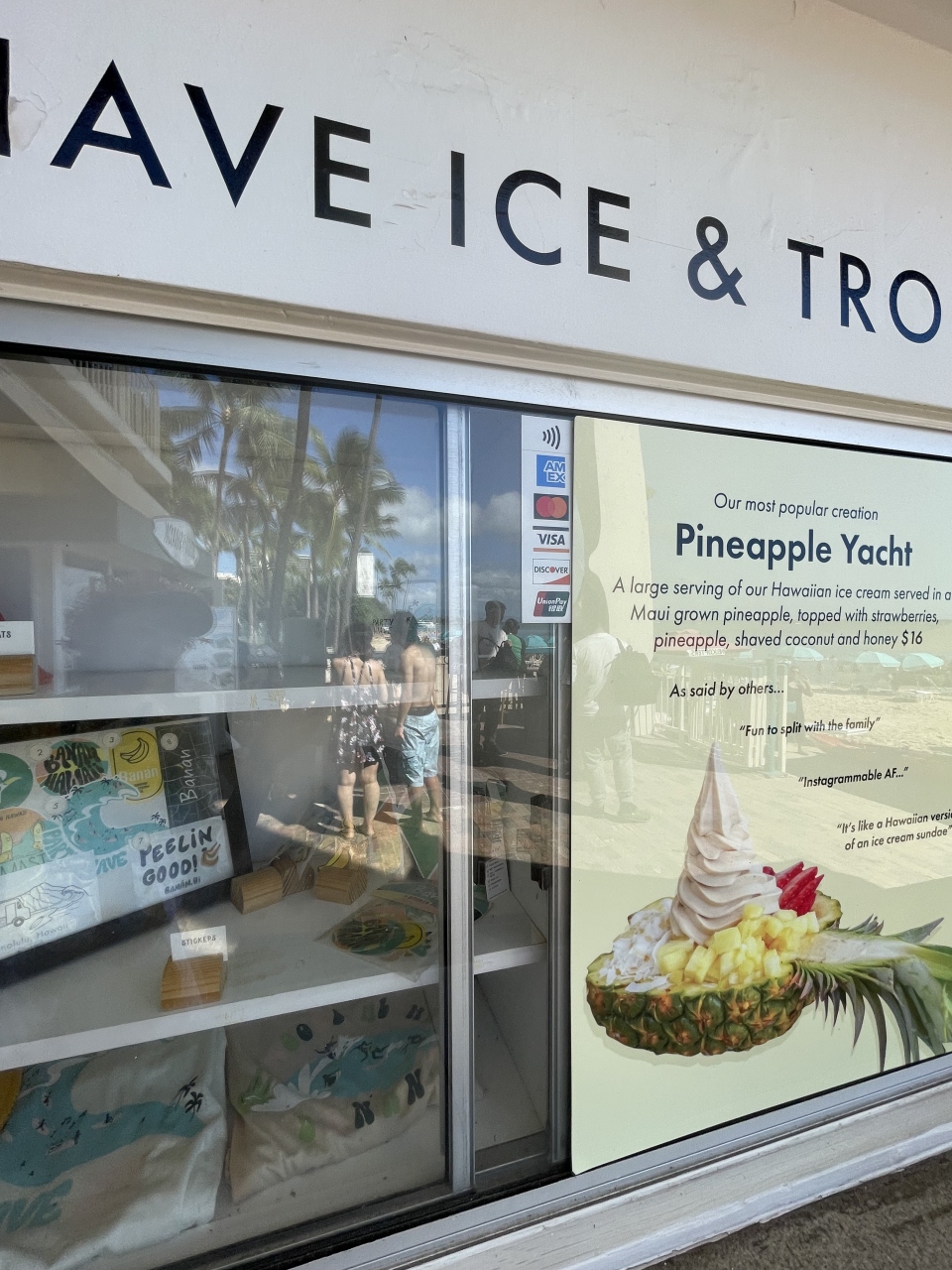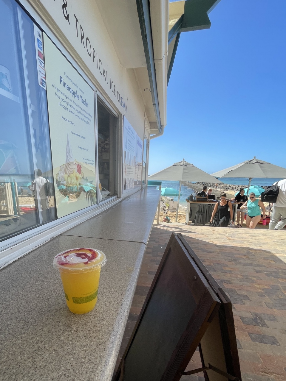 店頭のメニューで、パイナップルの上にたっぷりの生クリームが乗ったヨーグルトも美味しそうでしたが、立って食べられそうにありません。