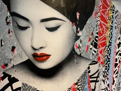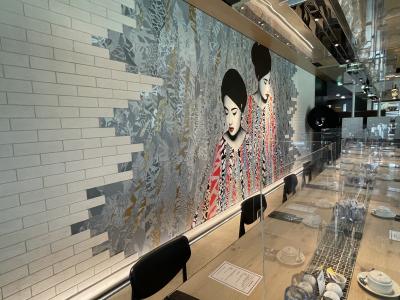 壁に女性の顔の絵が描かれていますが、アッシュという3年待ちの人気デザイナーさんの絵だそうで、顔の部分がベースで服の部分は上に重ねていく手法。