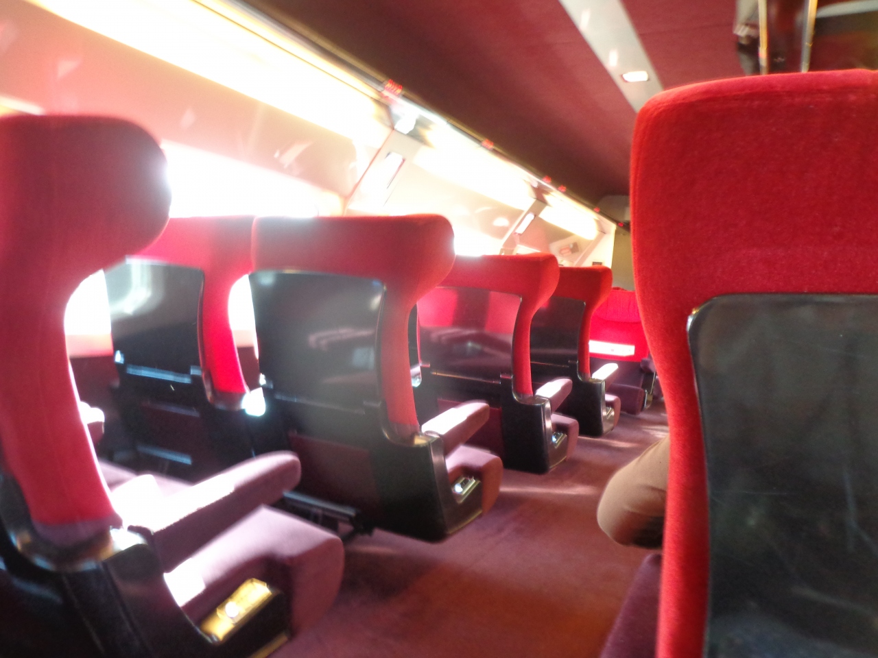 座席は普通に座れていれば多分快適だった筈。要するに行きも帰りも普通に座れなかった訳で、荷物置き場に自分のスーツケースを置くスペースがなく、かと言って座席上の荷物置き場に置くには重過ぎて持ち上げられず、結局自分の脚があるべきスペースにスーツケースを置くしかなく、2時間近く体をよじったままの状態(脚が通路に少しはみ出している)。