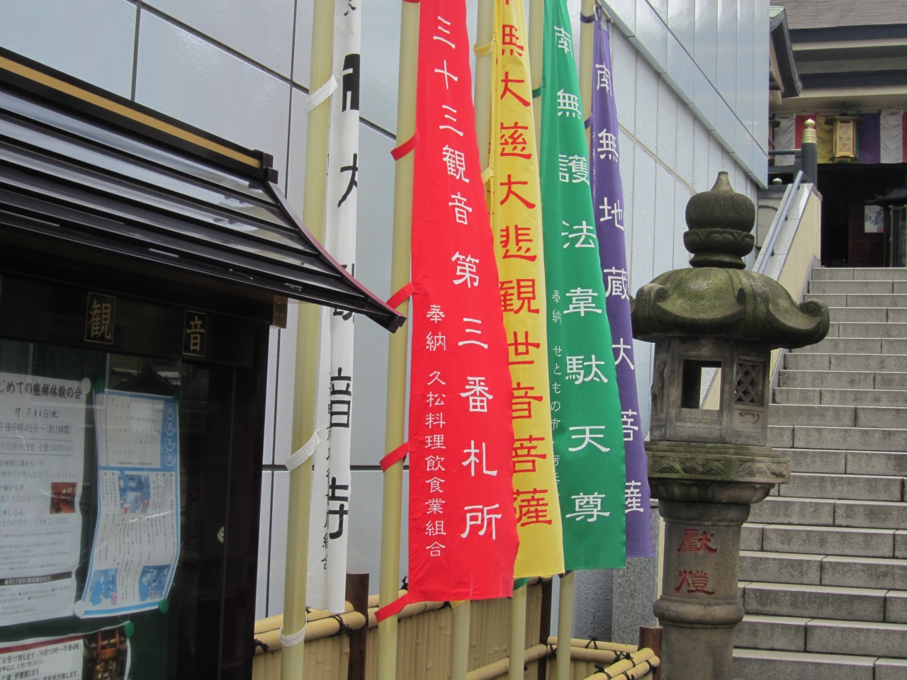 街中にありこじんまりとしていましたが本堂はなかなか立派なもので色とりどりののれんのようなものがはためいていていました。
