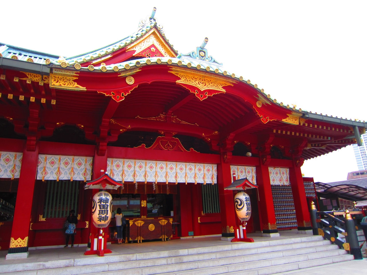 神田明神の本殿は朱塗りと装飾が鮮やかで、脇には達筆の提灯が掲げられていてとても立派でした。お参りすると心がすっとした気分になりました。境内には他にも大きな大黒様の像や恵比寿様の像があって見所たくさんでした。