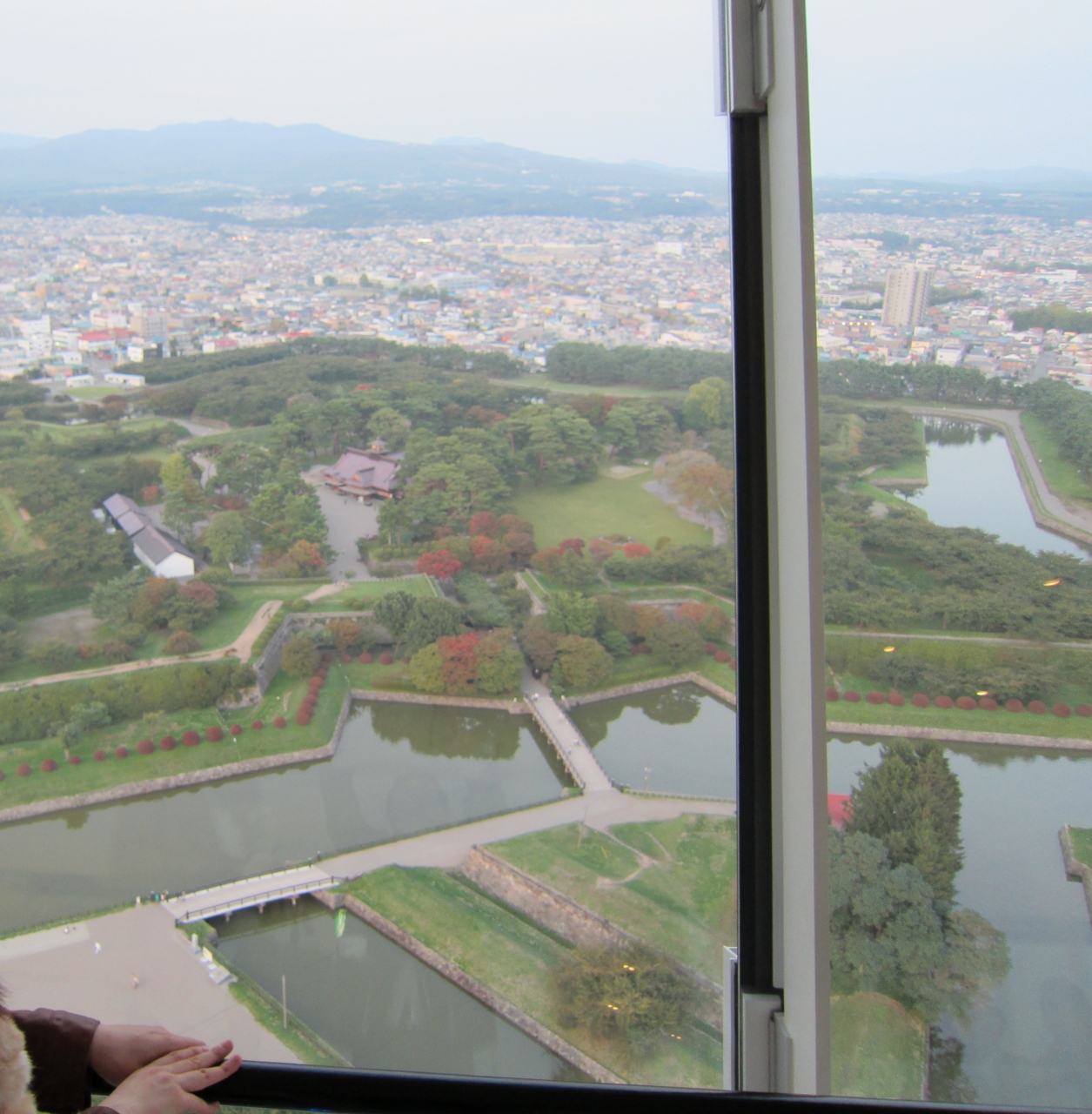エレベーターに乗ってタワーを登ると五稜郭の星型がまるまる見れるところに到着しました。本当にきれいな星型になっていておもしろかったです。