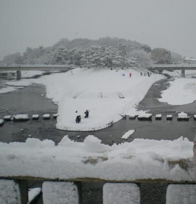 京都観光で鴨川沿いは何度も観光しておりますが、雪の鴨川は初めてでとても美しかったです。写真の場所は出町柳駅周辺で鴨川が二手に分かれるとこです。