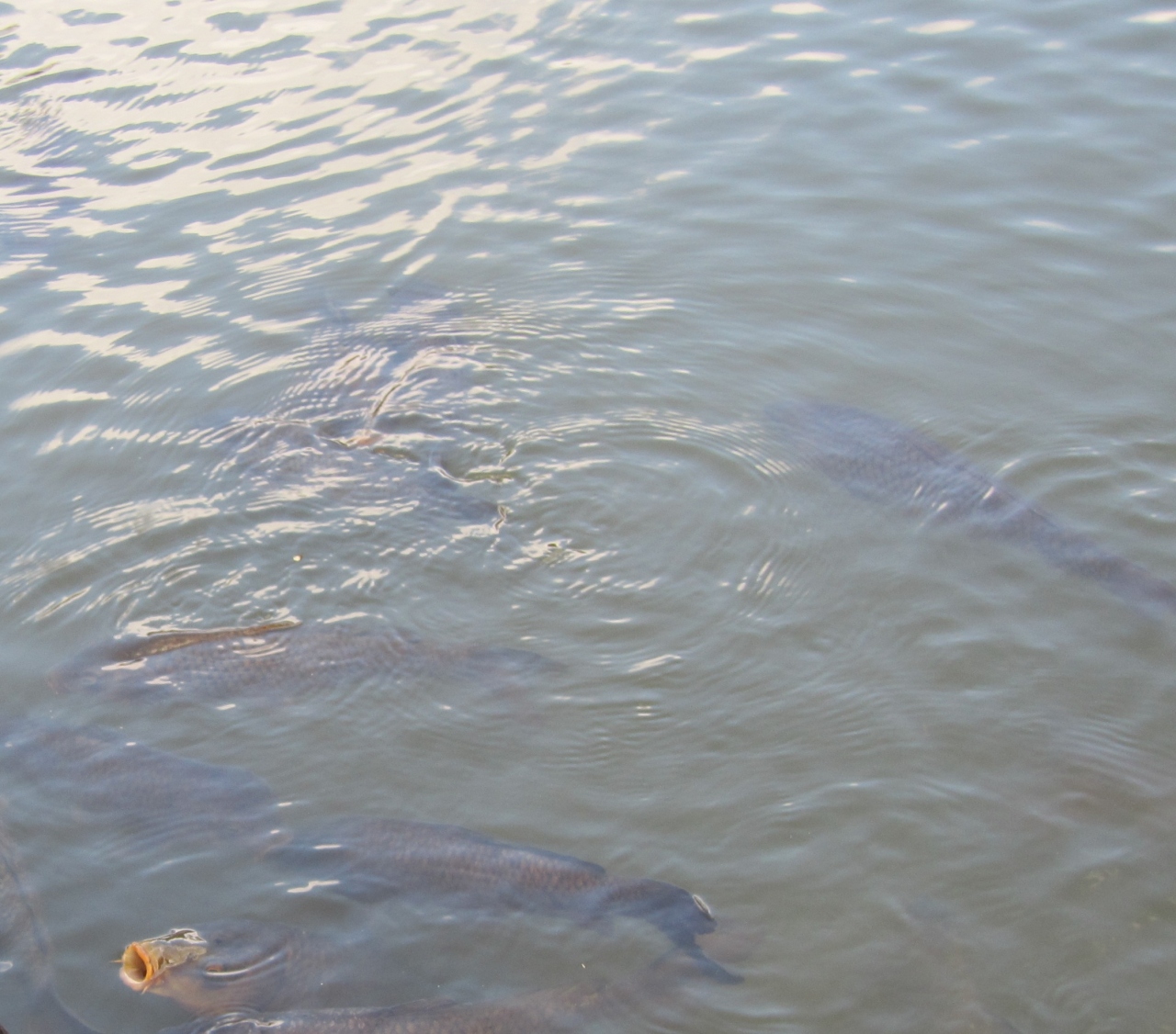 お池には鯉がたくさんいました。淵に立つと近寄ってきます。