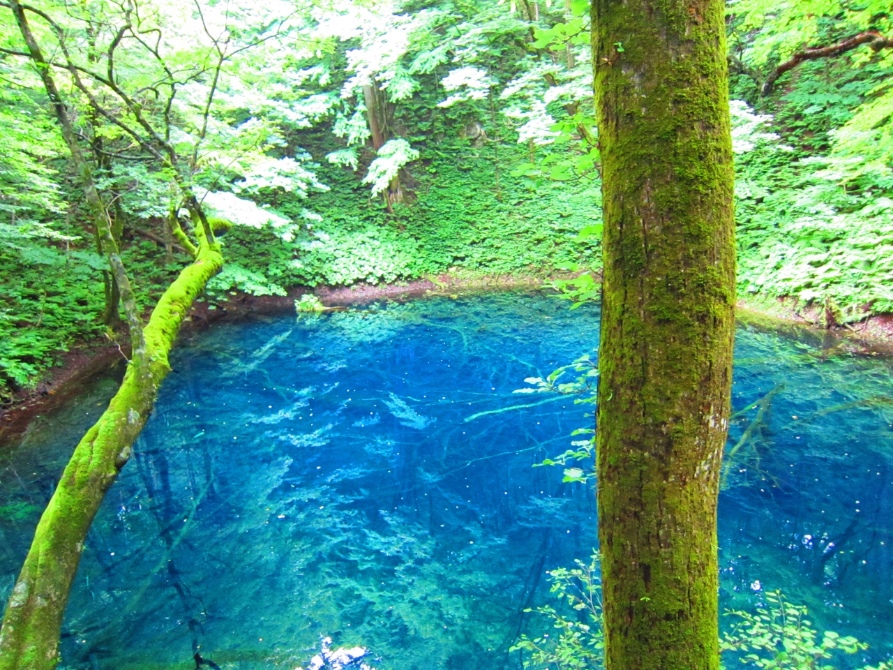 まわりにもけとばの池やがま池、沸壷の池などたくさんの池があっていろいろと散策しましたが、この青池が群を抜いて美しく素敵でした。