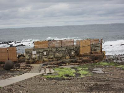 ガンガラ穴というせっぺきにあいたけっこうな大きさの海蝕洞窟が遠くからでも見ることができました。天気がよくなかったためコバルトブルーの水面を望むことはできませんでしたが、天気のいいときは水面がとても美しいようです。
