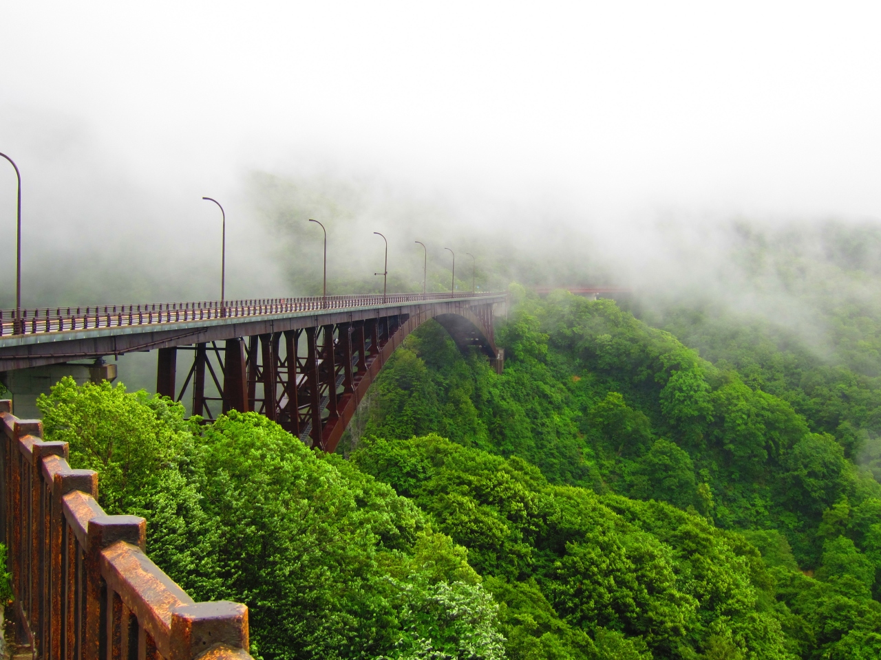 十和田湖から山道を登って酸ヶ湯温泉などに立ち寄って、その後の弘前方面に抜ける道の途中にあります。今回の旅行では天気があまりよくなかったため、大橋から一面の山々を望むことはできませんでしたが、霧がかかっている幻想的な大橋を見ることができました。橋に入るまえにはビュースポットとして駐車場が用意されているので観光に便利でした。