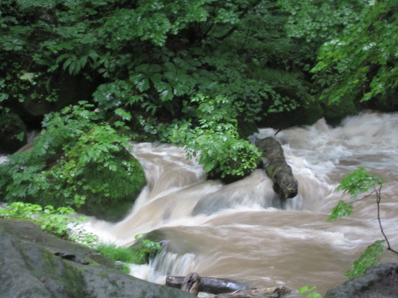 前日からの大雨で奥入瀬の水量が大幅に増加していて泥水で濁っていたため、阿修羅の流れも美しい流れではなく、まさに阿修羅が憤怒しているような荒々しい流れへと変貌をとげていました。インターネットや観光案内で見られる流れを期待してはいましたが、なかなか見ることができないであろう激しい流れを見れてそれはそれで満足でした。
