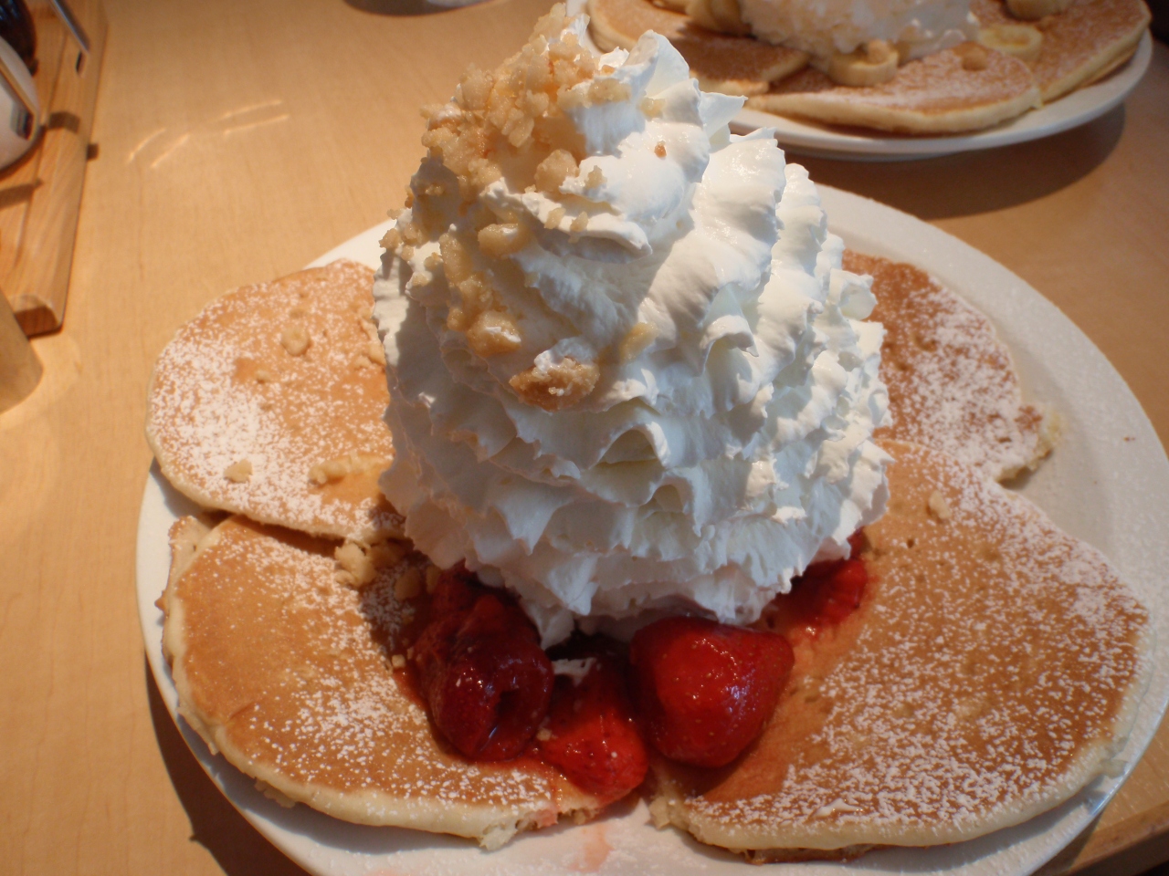 ストロベリーホイップクリームとマカデミアナッツのパンケーキを注文しました。ホイップは軽くてとてもおいしく完食できるかもと最初は思ったのですが半分でいっぱいでした。二人で行くなら二人ともパンケーキにするのでなく一人オムレツ、一人パンケーキとかにすればよかったのかも。再訪はないかもしれませんがあのインパクトのパンケーキは一度食べたかったので満足でした。店を出るときにはいつも通り行列ができていたので朝一番に行くのがいいと思いました。- 旅行時期