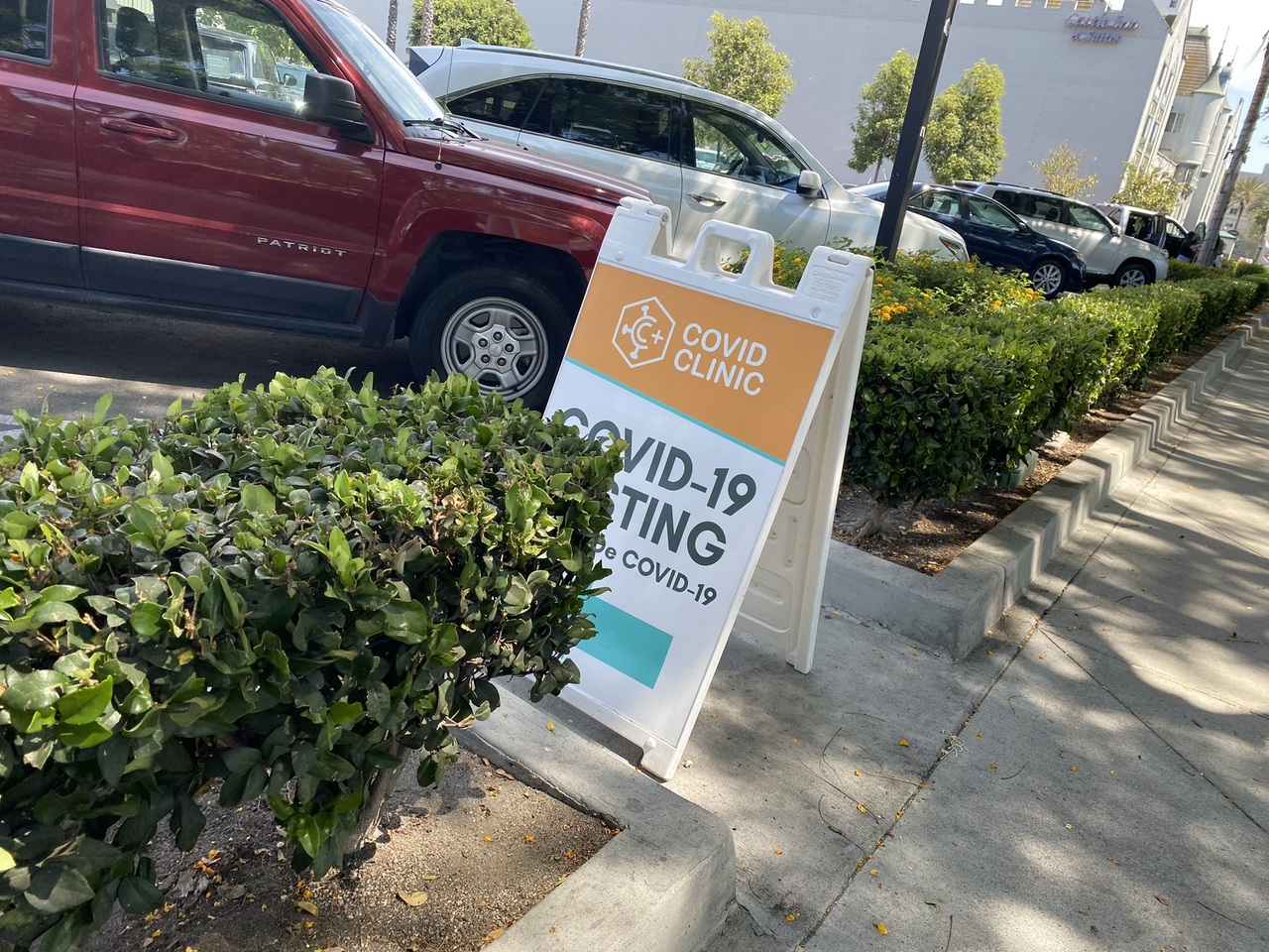 実際に現地に行くと、アナハイムホテルの正面エントランスから見て、一番右端、ギフトショップの横にありました。ホテル前の歩道にも「COVID CLINIC COVID-19 TESTING」と看板が出てました。